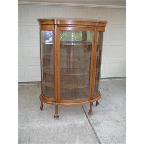 Here is an attractive, oak, curved glass china cabinet with clawfeet. This cabinet, made about 1910, incorporates some empire styling and victorian clawfeet. The cabinet stands 66 inches tall and 47 inches wide at the feet. Each clawfoot has an acanthus leaf carved on the top knee of each leg. This cabinet has curved glass on each side and also in the front door. It retains the original lock and key. It has four , oak shelves with the dish display groove in each. This cabinet has been completely reglued and refinished. Shipping cost depend on location in the lower 48 states. This cabinet requires a blanket wrapped shipper familiar with handling antique furniture.
