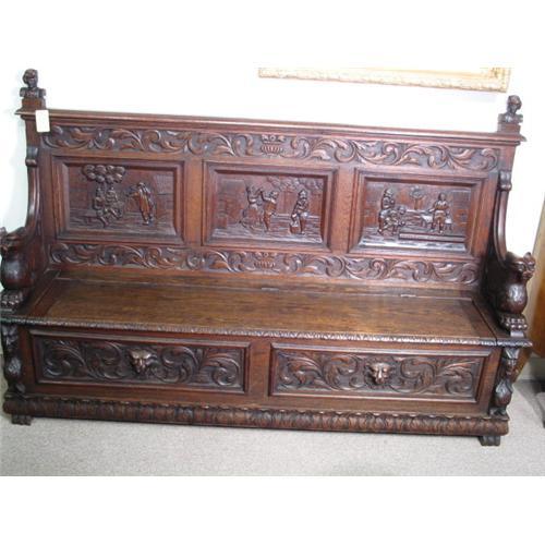 RARE European Monk's Bench with three back panels depicting merrymaking, dancing, fiddling, playing alley bowls etc. Seat storage. Stylised lions on arms and lions' heads on the base panels. Aristocrat's busts on backrest. Exceptional carvings and patina. c.1860