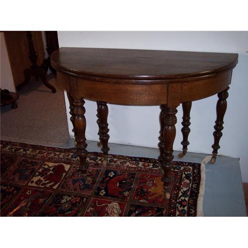 Very unusual folding oak dining table. Table has eight legs for good support when opened. Has a hidden drawer in back for silver ware etc. Very small when closed and not needed. Opens to eight plus feet. No leaves with table but easy to make. I would use plywwod leaves and table cloth for big occasions. Excellent original condition.