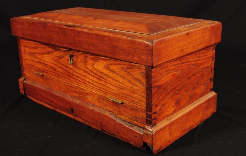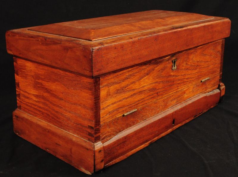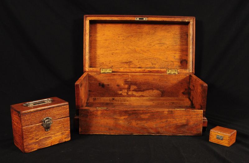 Oak Dove Tailed Box and 2 Graduated Oak Boxes. Largest Measures 9" x 20" x 10", Mid Size is 5 1/2" x 7" x 4", Smallest is 2" x 3" x 2 1/2"