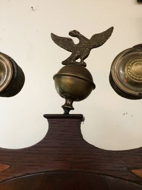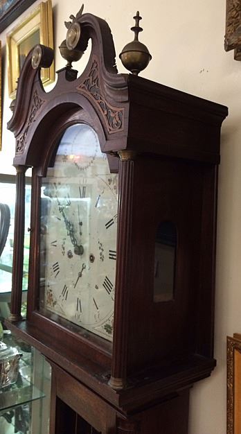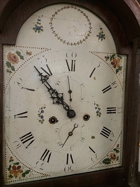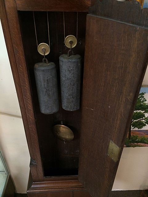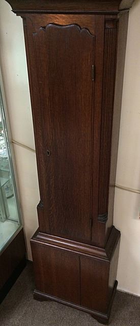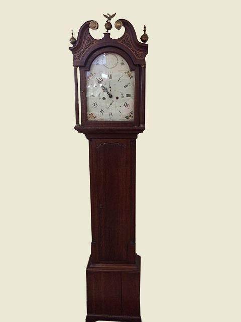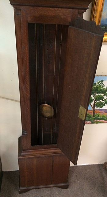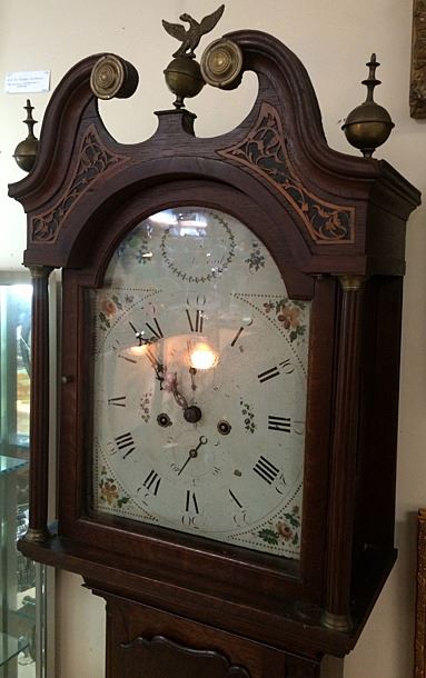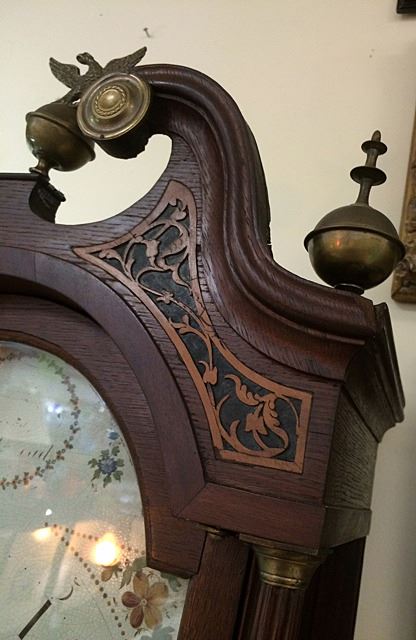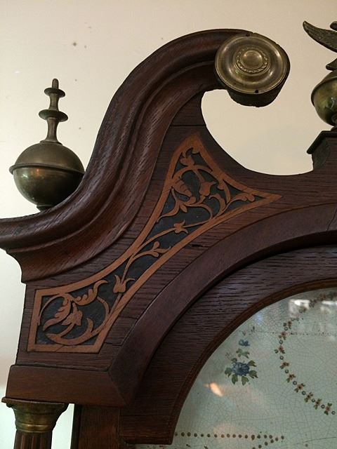 Oak English Grandfatther clock with unusual inaly at top, 2nd bit and calendar all in running condition. Beautiful flower dial, brass finials with eagle and brass caps at top, 2 weights and pendulum. Inlay at top is floral design. Measures approx. 82" tall, beautiful oak case.