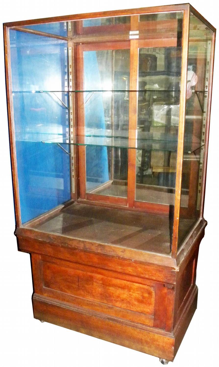 Oak Floor Model Showcase with mahogany base. Comes with two glass shelves. Base has been trimmed on one side otherwise good condition. 35 X 68 1/2 X 25 inches overall.