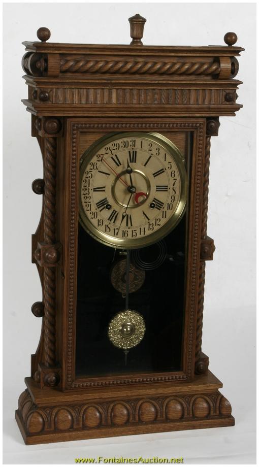 Oak Gilbert Long Branch Calendar Clock. Black open spade hands, red moon calendar hand, black Roman numerals on the chapter ring and black Arabic numerals on the calendar ring, 7" paper dial. Brass eight day time and strike calendar movement with a single coiled gong, signed. Oak carved Long Branch case with turned finials and spiral turned columns, replaced door glass. 15"W x 29"H x 5"D. Estimated Value$700 - 900.