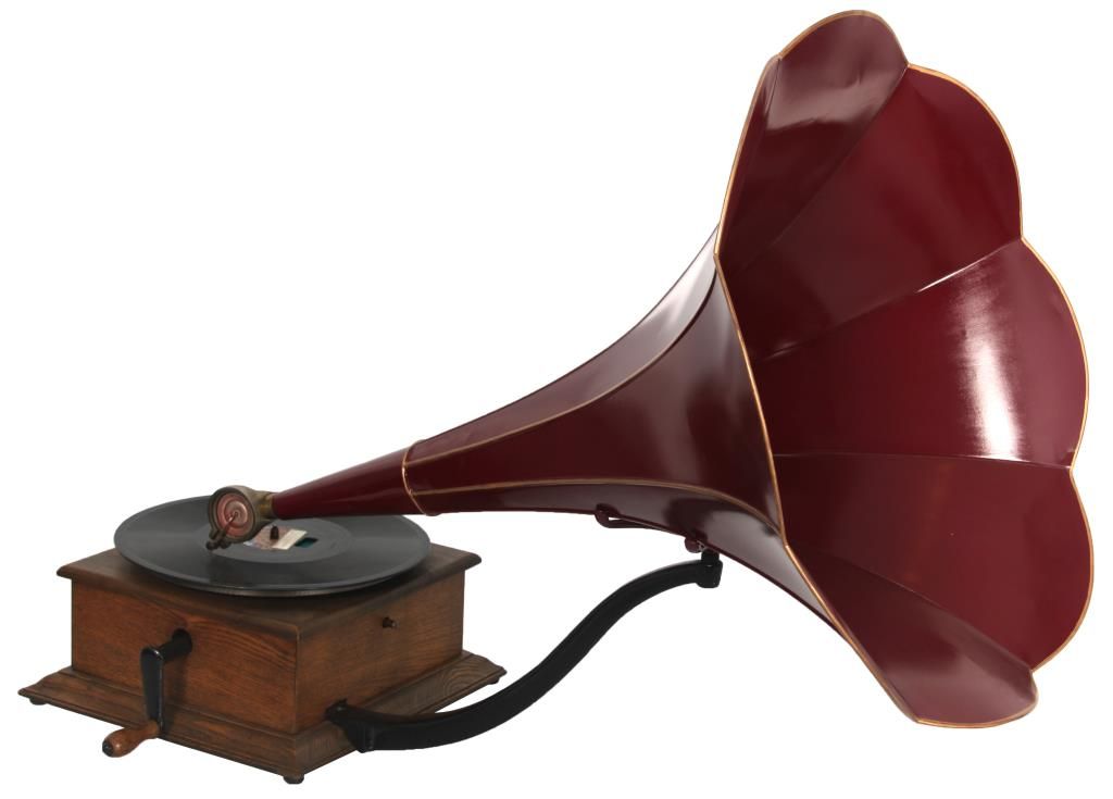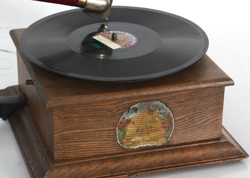 Oak Grand Busy Bee Phonograph. Oak case has a black painted iron rear mounted support arm, 10 in. spring driven turntable, colorful decal on the side reads “Grand Busy Bee, Sole Owners, Oneil, James Co. Chicago”. 8 panel horn with scalloped rim, repainted maroon with gilt highlighted ribs and has a Mobley diaphragm reproducer. Stamped serial number on the motor chassis 28350. Overall dimensions 24 in. high x 11.5 in. wide x 31 in. deep.