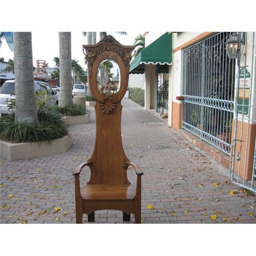 Very fancy American hall seat. Fancy shaped original beveled mirror. Solid quarter sawed oak with very fine grain. This hall seat or tree is a only 26 inches wide, will fit anywhere. Has been professionally restored and is ready to be placed in your home. Circa 1900