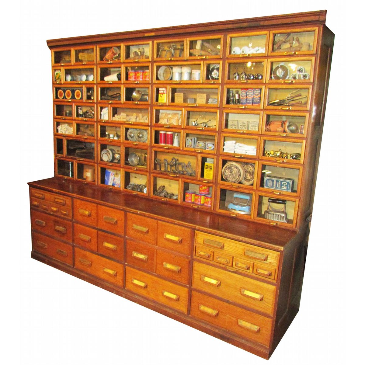 Oak Hardware Store Cabinet. Warren Cabinet. All original "out" tags, hardware and drawers. Excellent all original condition. 100 X 86 X 29 1/2
