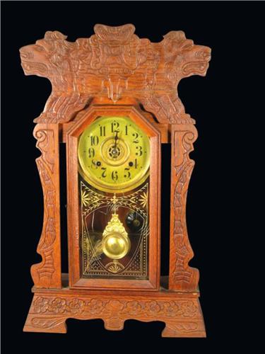 Oak Kitchen Clock, New Haven Clock Co. New Haven, CT. Lion head motif. Excellent original condition. 15 X 25 inches.