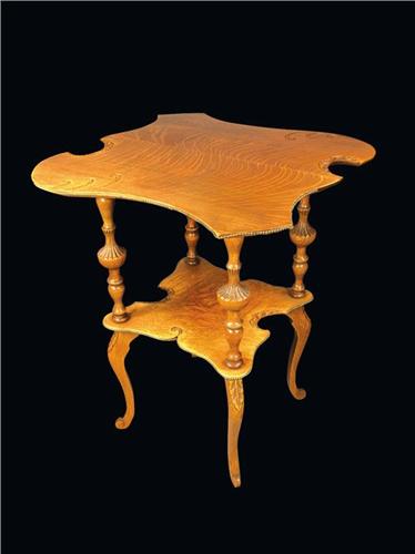 Oak Lamp Table, unusual scalloped detail top with lower shelf. 24 X 24 X 30 inches.