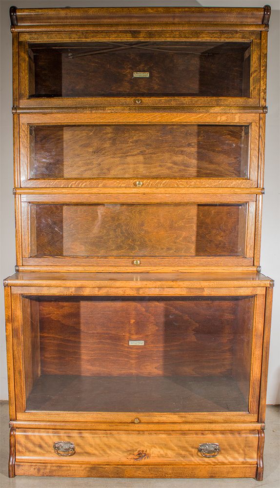 c1900 Choice oak stacking bookcase, 4 units. The lower unit is twice the size of the 3 stacked aboveit. All feature movable glass fronts. There is metal banding around the cnter of each piece. The stacked cases measure 34" wide x 20" deep, and stand 61" tall. Beautifully refinished, a beautiful piece. Fairbanks Collection - HKA#66075