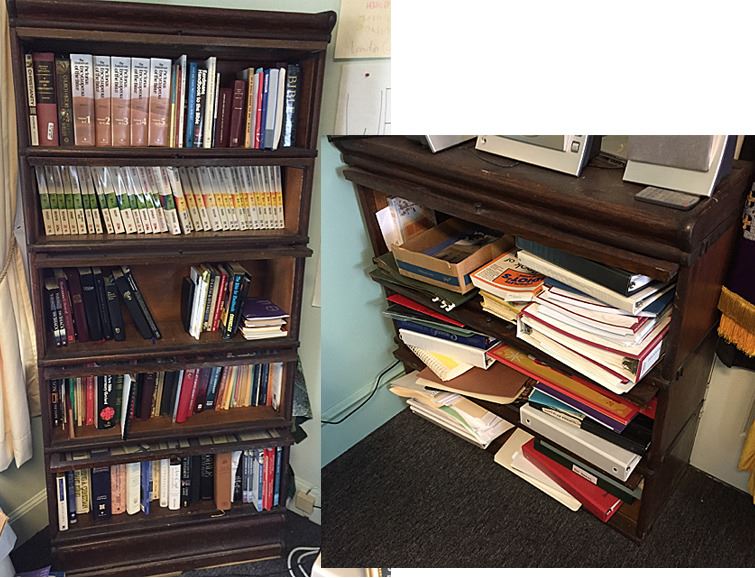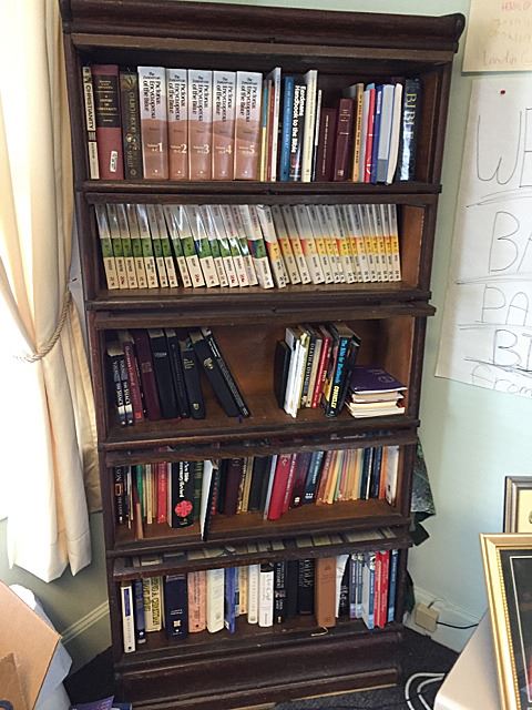 Oak Lawyers bookcase 8 stackable sections, bookcase is being used with 5 sections, has 3 more additional sections. Sections are graduated, all sections have glass doors, contents not included.