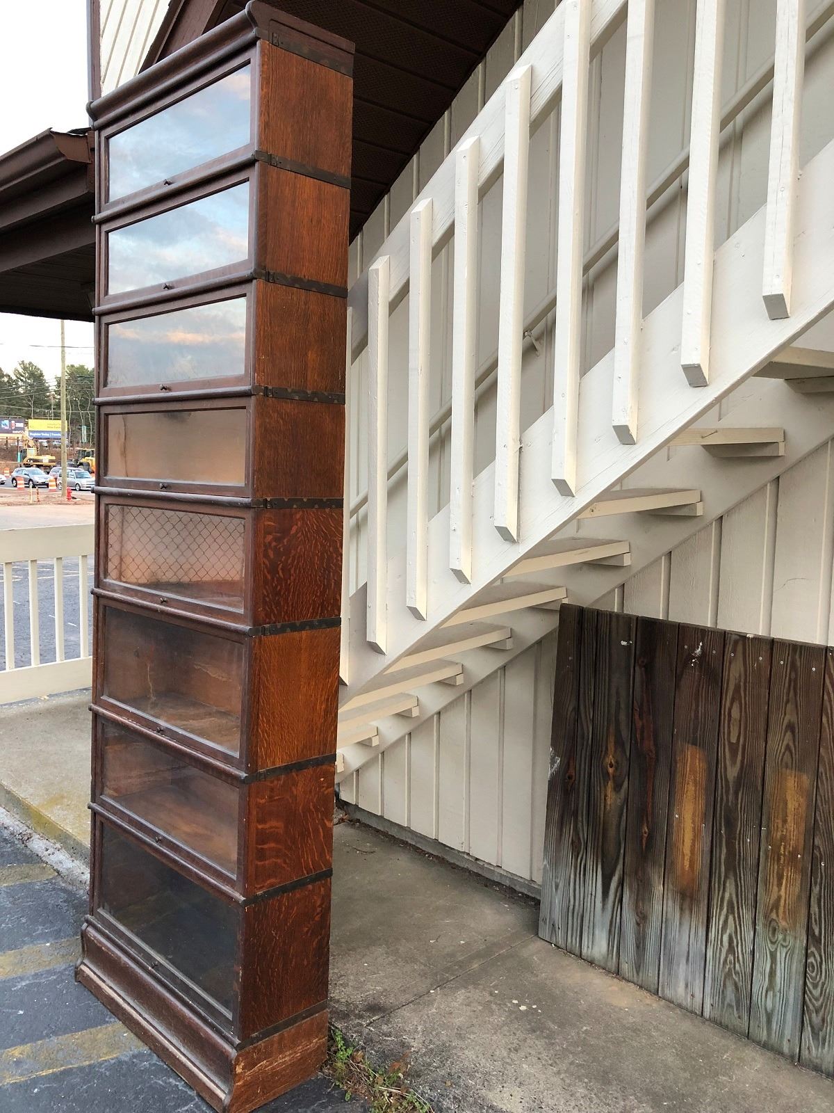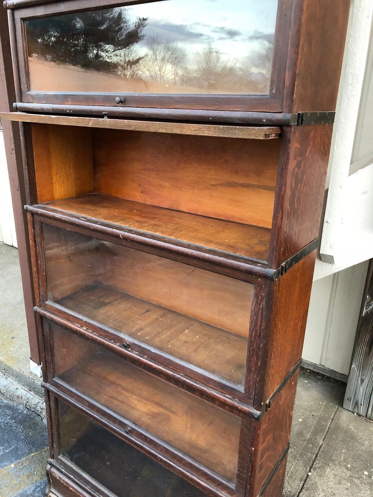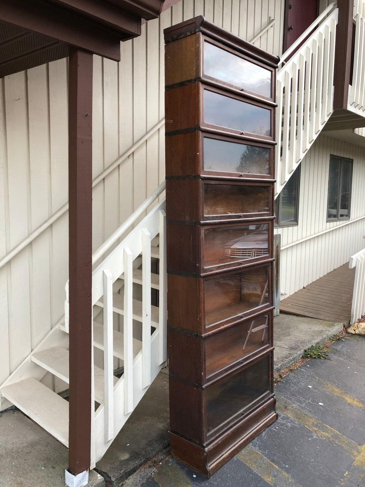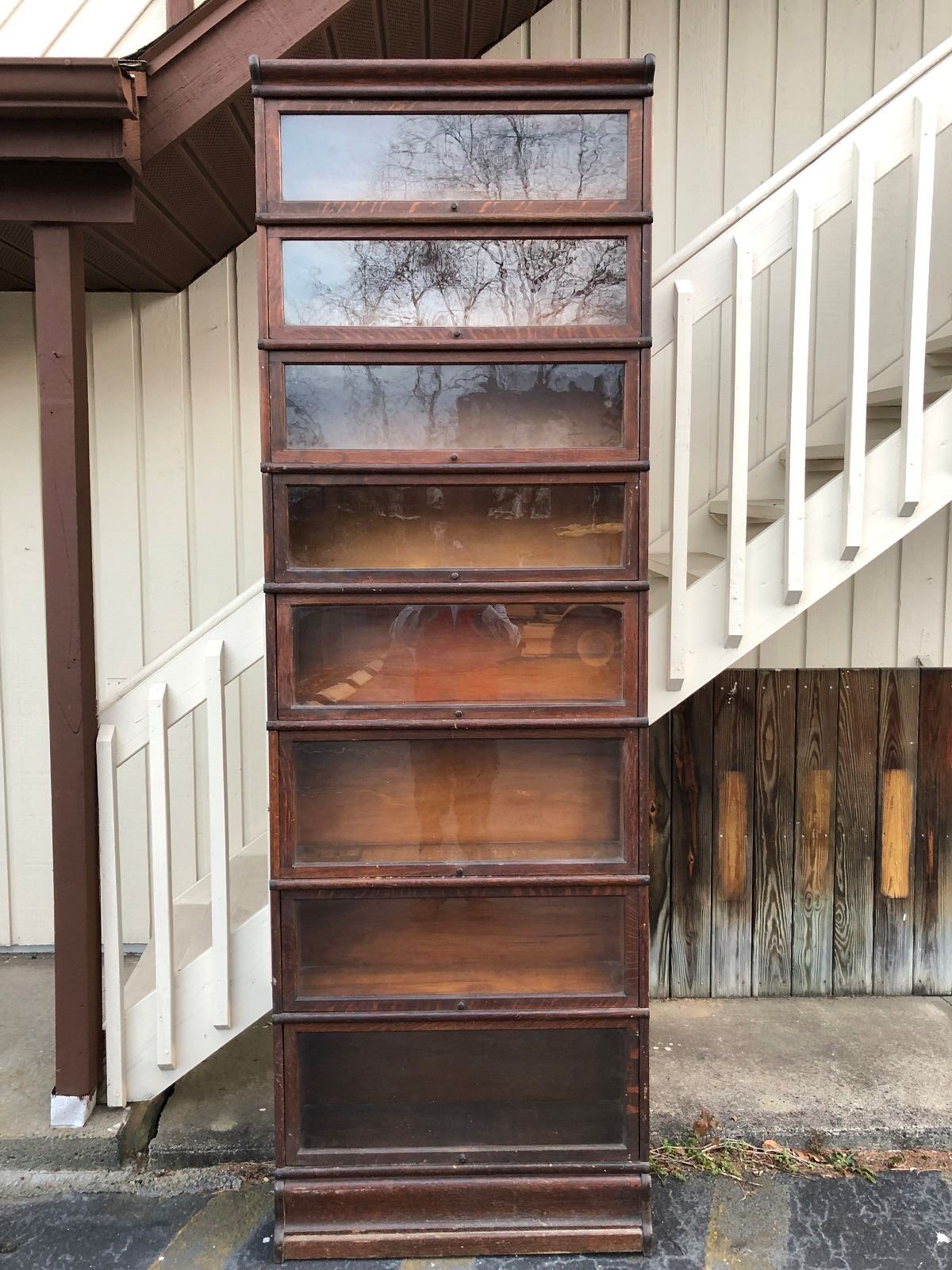 Oak Lawyers bookcase 8 stackable sections, bookcase is being used with 5 sections, has 3 more additional sections. Sections are graduated, all sections have glass doors, contents not included.