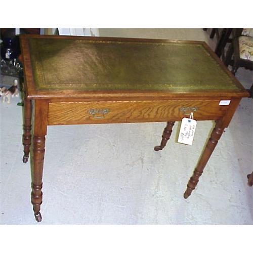</font></strong>Oak Leather Top Writing Table C. 1880, nice original hardware. 36"X17.75"X29.75"</font>