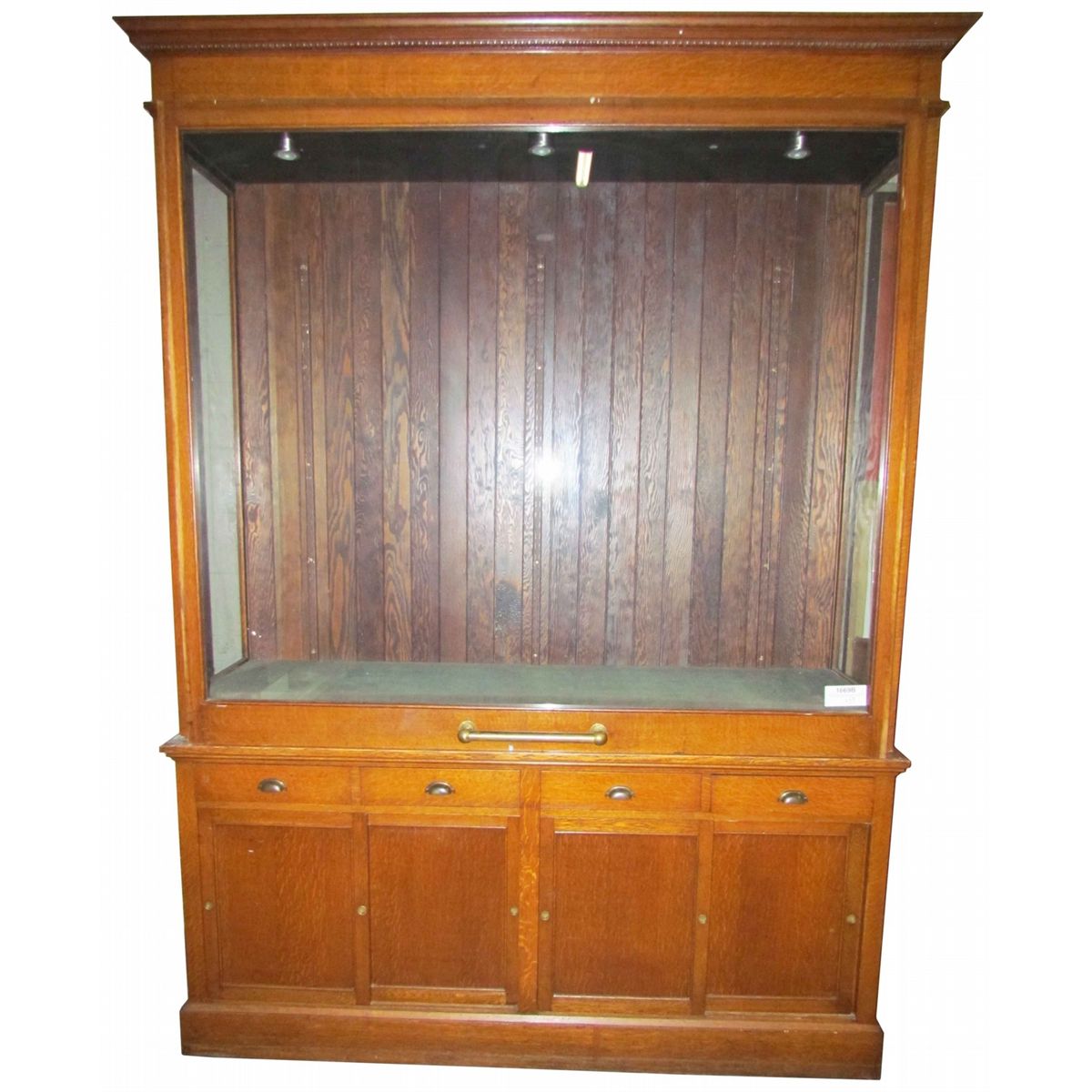 Oak Millinery Cabinet. Came out of a Department store in Denver, Colorado. Turn of the century. Rare lift up front with counter weight. Excellent Condition. 72 1/2 X 102 X 22 1/2 inches.