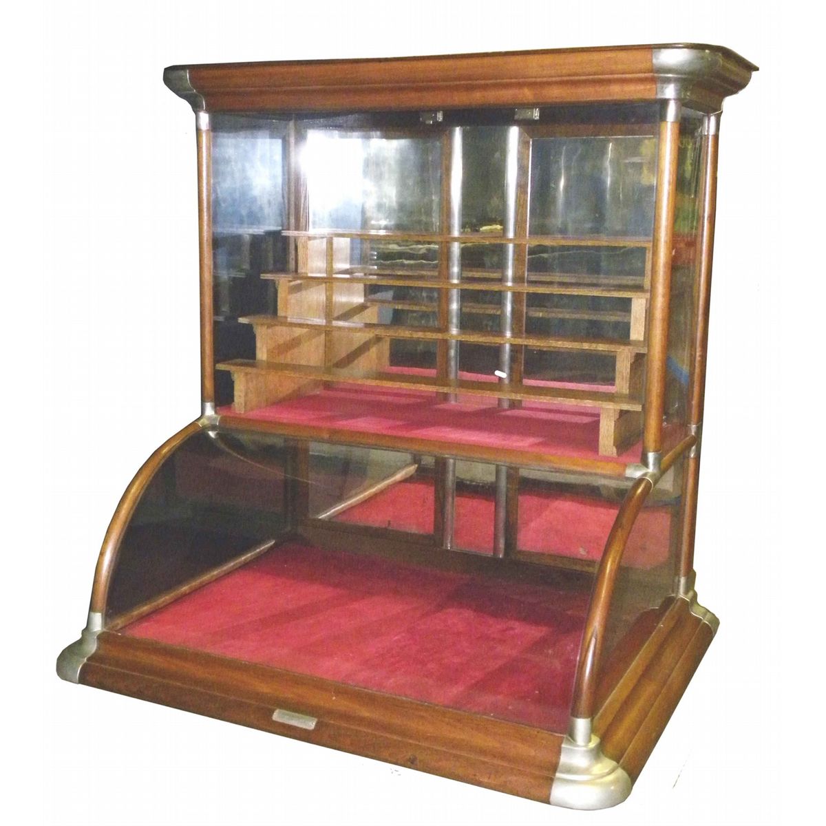 Oak, Nickeled Cornered, Curved Glass Showcase. Original brass tag, Excelsior Showcase Company, Quincy, IL. Excellent condition. 37 X 37 1/2 X 27 inches.