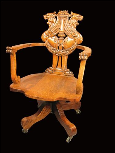 Oak Office Chair with wing griffin, swivel base and claw arms. Excellent refinished condition. 24 X adjustable to 40 inches.