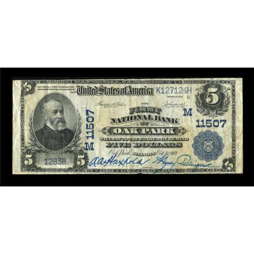 <B>Oak Park, IL</B></I> - $5 1902 Plain Back Fr. 606 <B>The First NB</B></I> Ch. # (M)11507<BR> Notes from this one bank Chicago area suburb are always in demand, with the population of just eight pieces clearly not enough to satisfy all the collectors who want an Oak Park example. Bright <B>Fine-Very Fine, </B></I>with great pen signatures. <BR><BR><b>Shipping:</b> Coins & Currency (<a target="_blank" href="http://www.heritageauctions.com/common/shipping.php">view shipping information</a>)