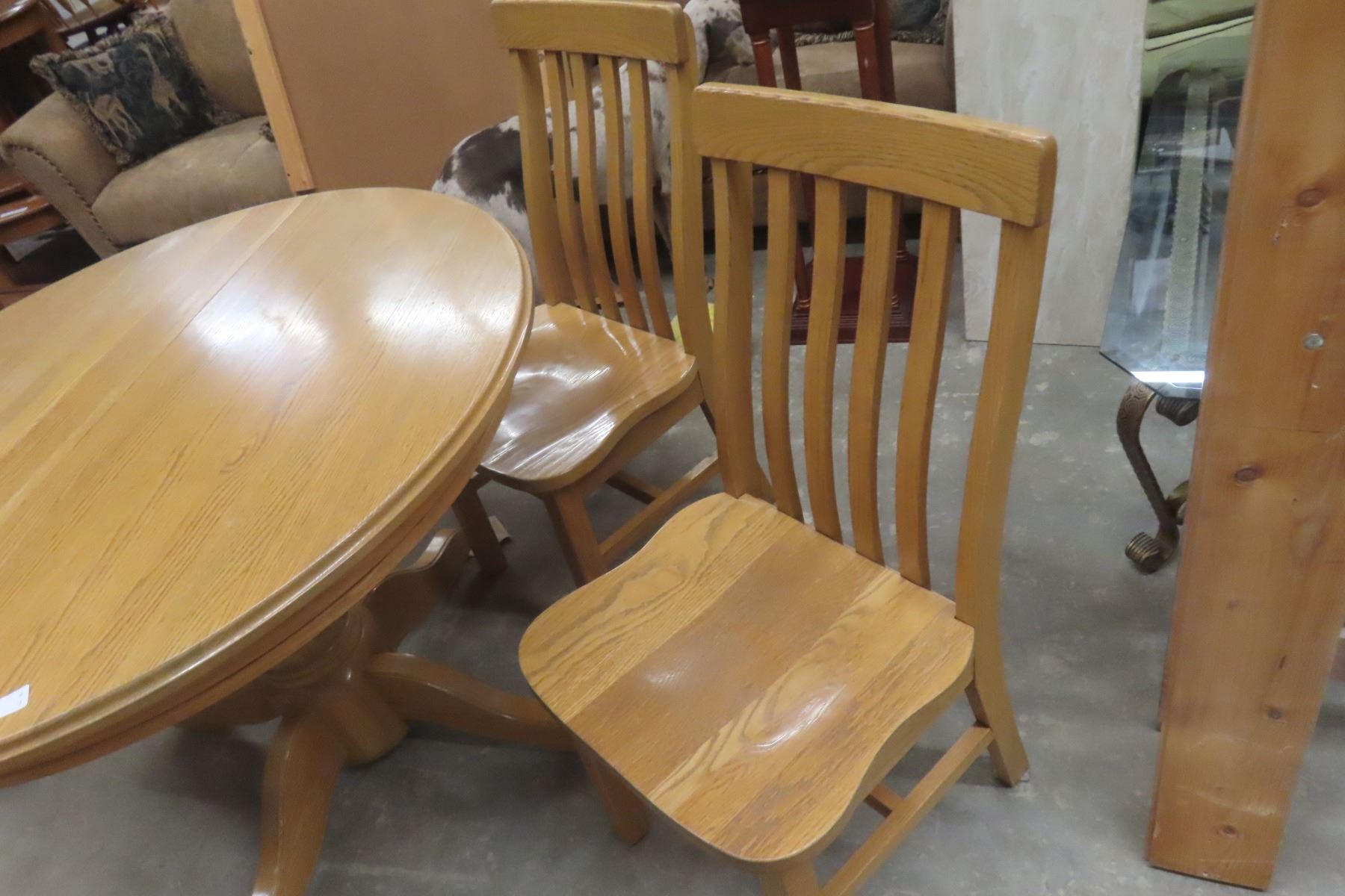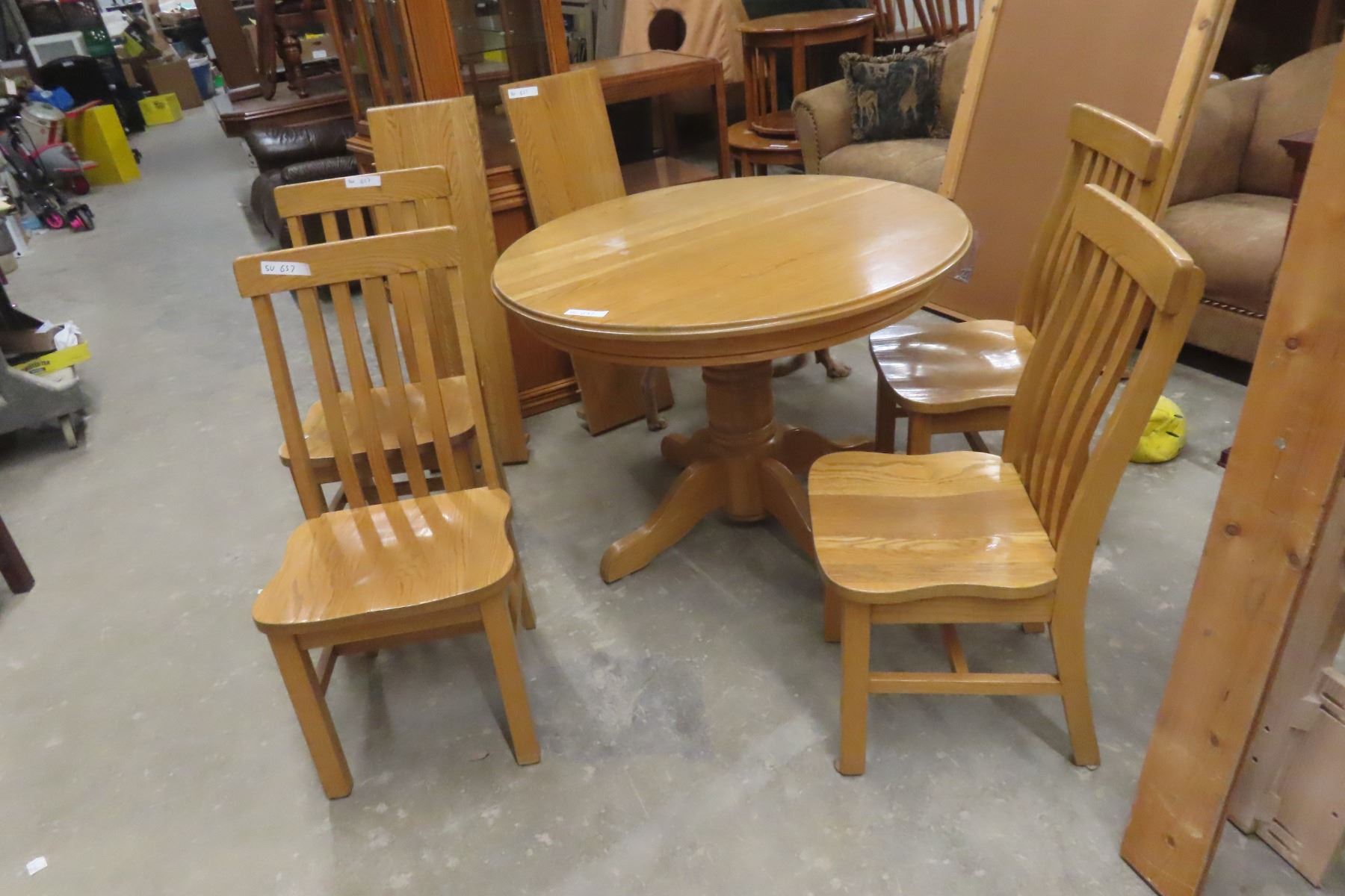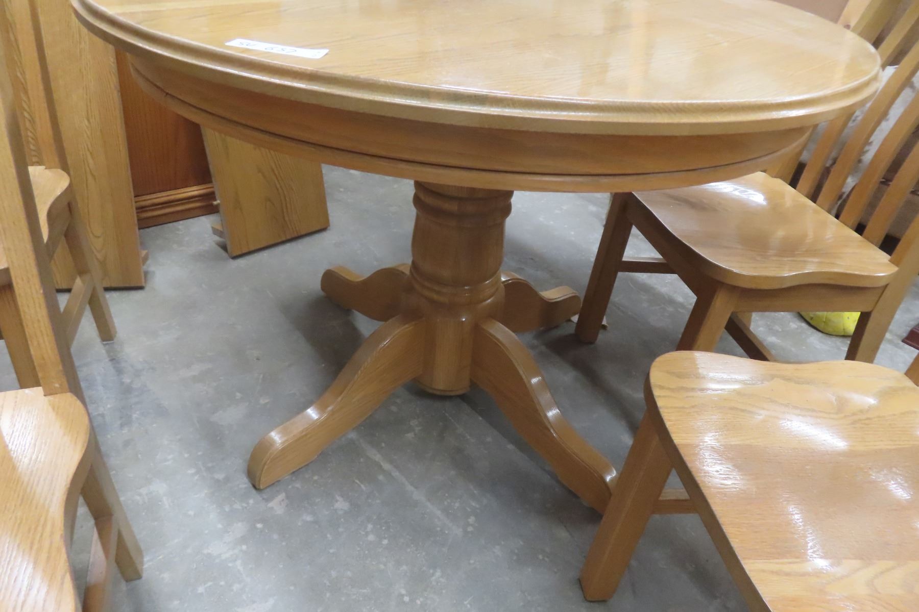 Oak Pedestal Table, 30" High, 42" Diameter, With Two 12" Leaves and Four Chairs