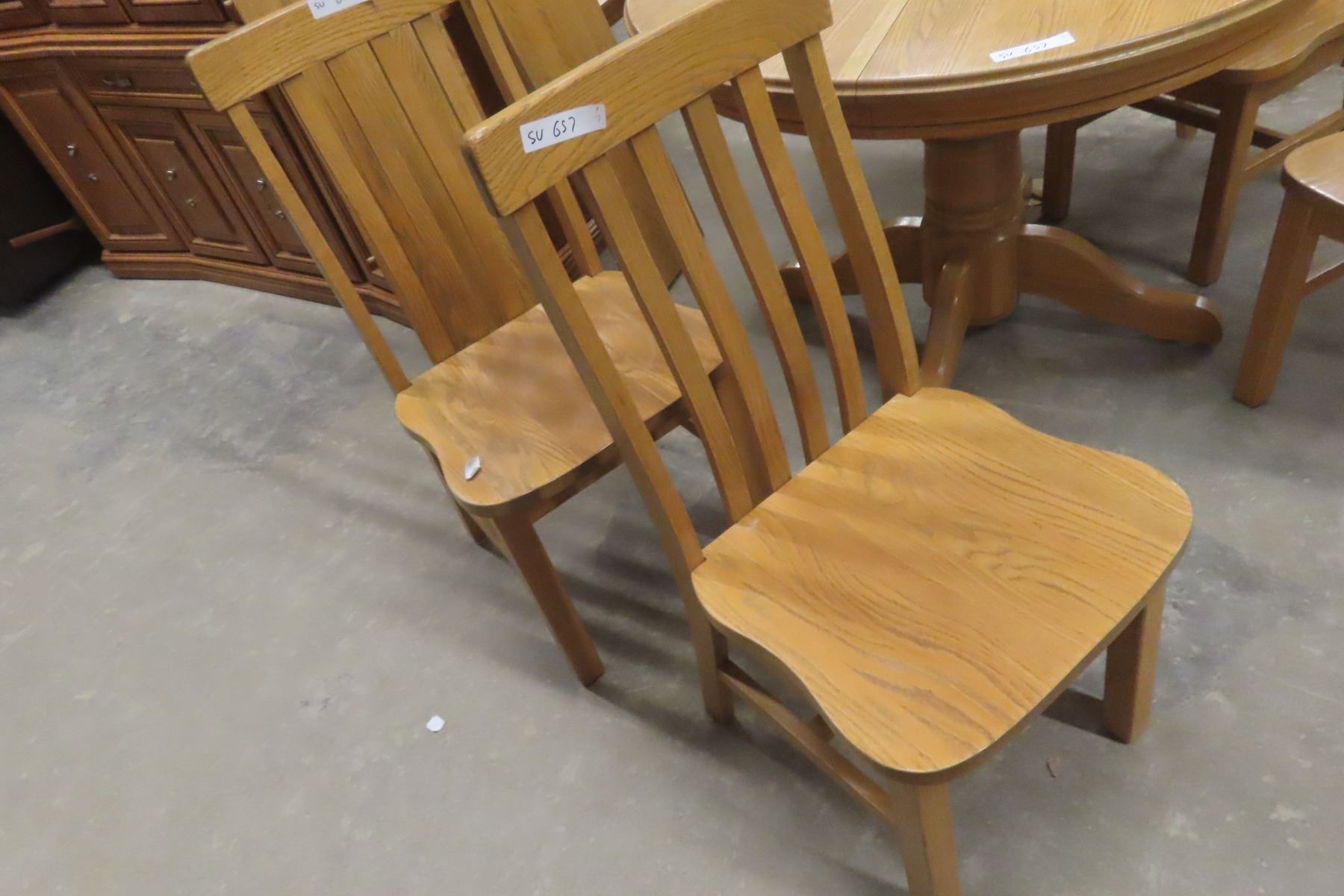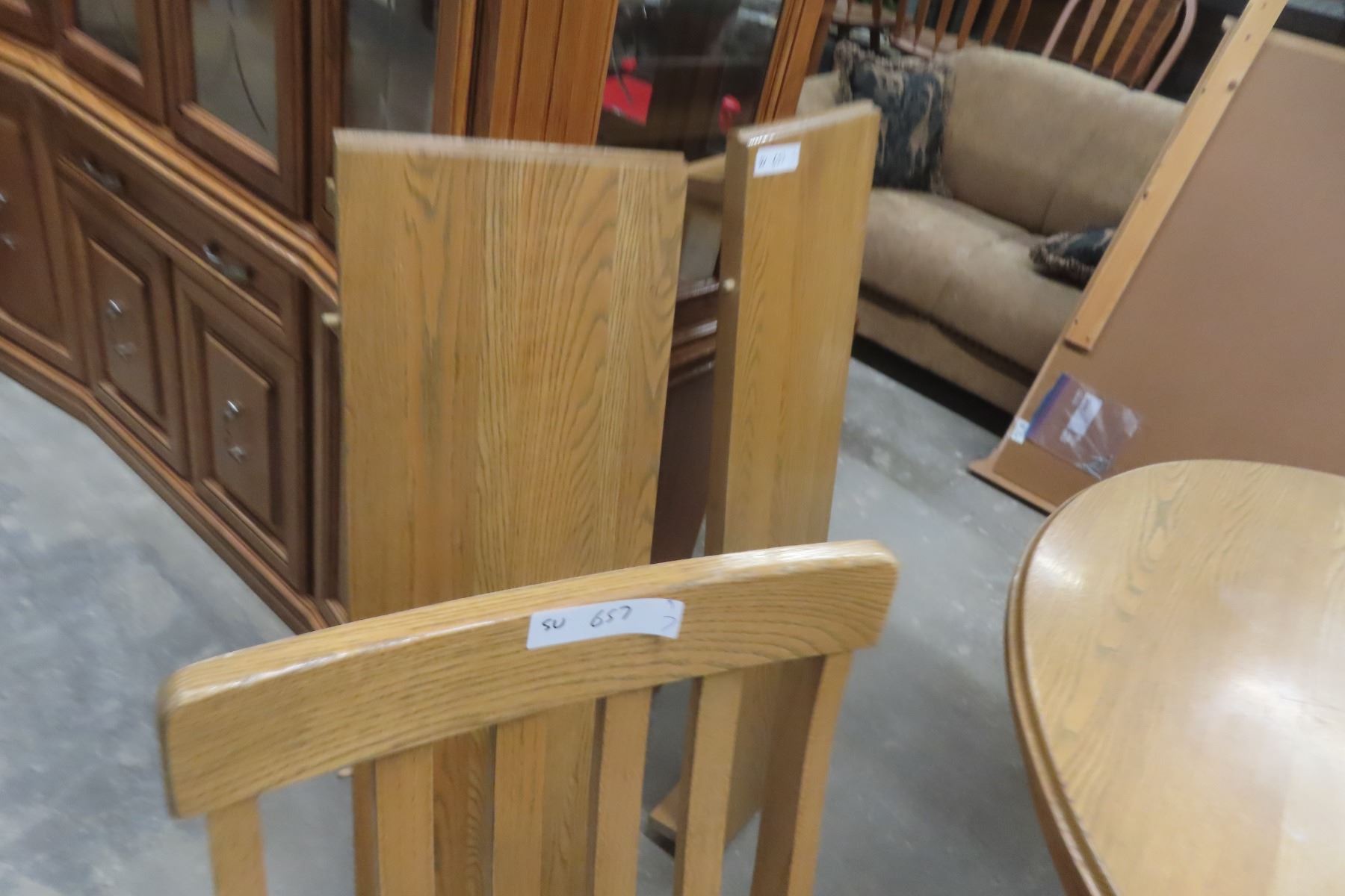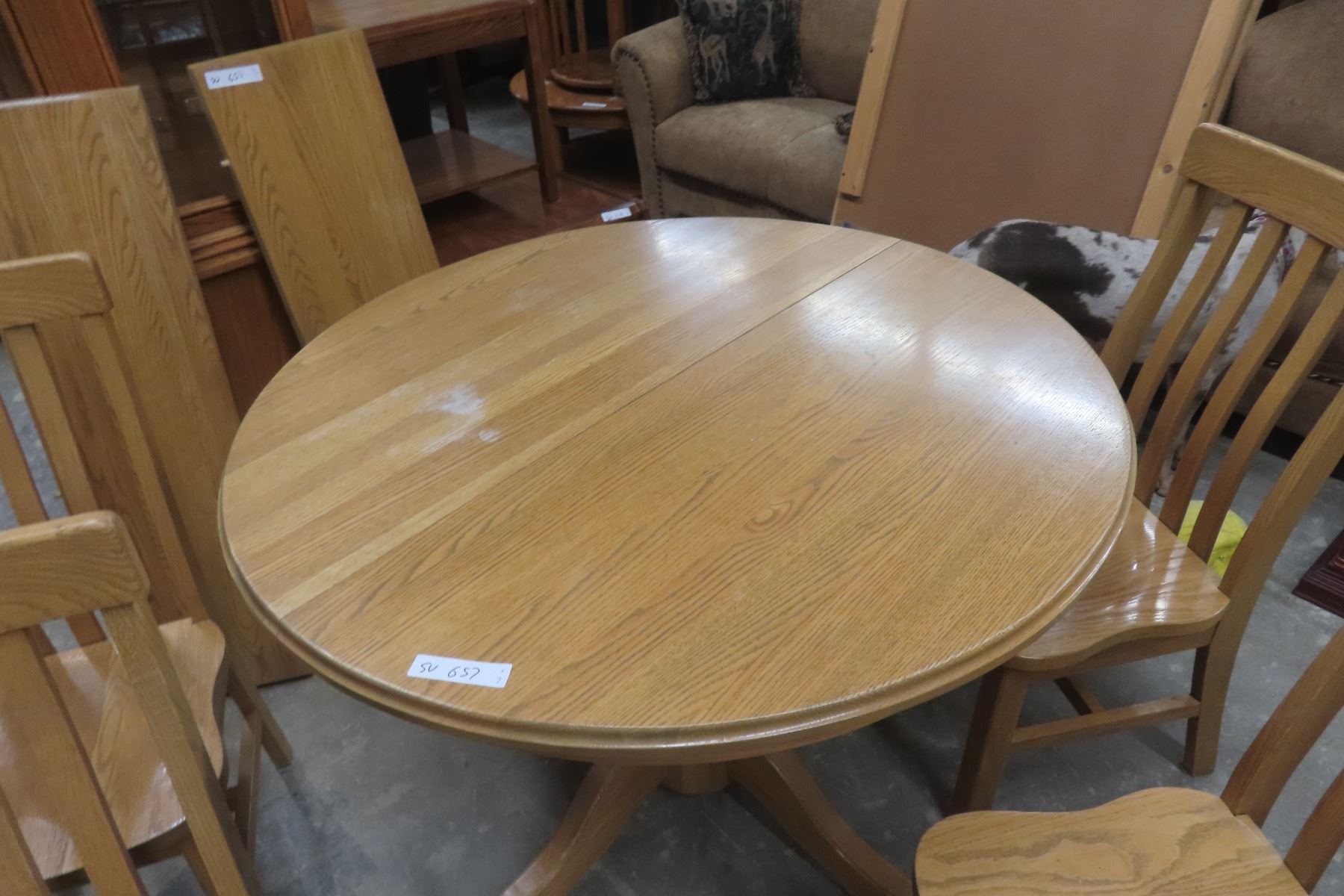 Oak Pedestal Table, 30" High, 42" Diameter, With Two 12" Leaves and Four Chairs