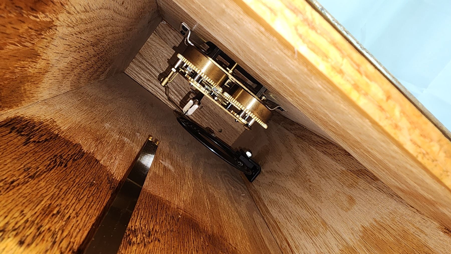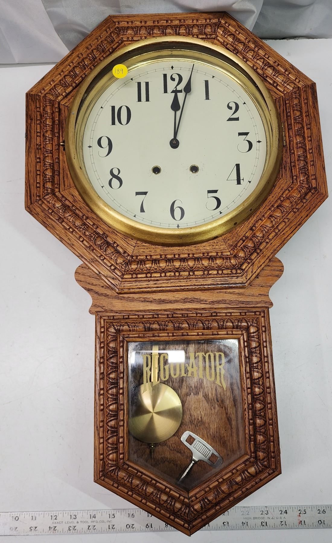 Oak "Regulator" school house clock, complete with key & pendelum - 26"x15"W