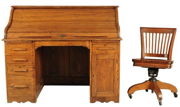 Roll top desk & chair marked Milwaukee Chair Company #3151. 54" x 30" x 44"