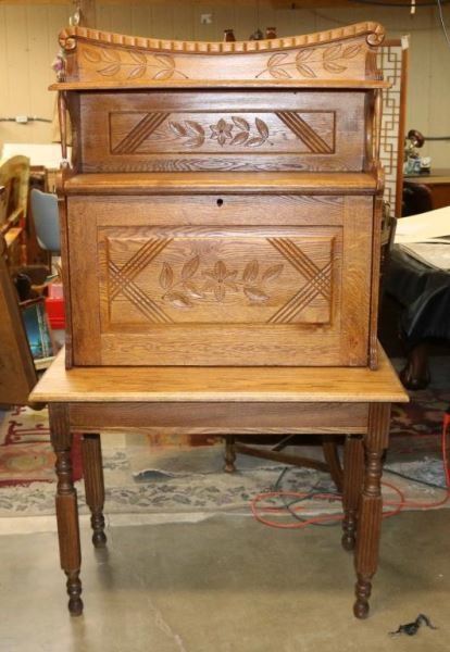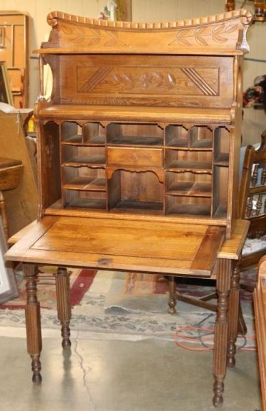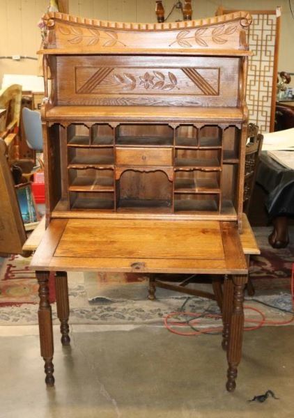 Carved floral motif drop leaf desk reveals compartments and a single drawer for interior storage. NIcely carved spindle legs. Measures 37 3/4"l x 20"w x 64 1/2"h.
