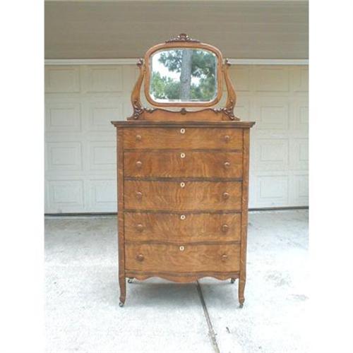 Here is a chest of drawers with a mirror and 5 triple serpentine drawers. The drawers fronts and the chest top have large tiger stripe oak grain making this chest look fantastic. Each drawer has the original wooden pulls and the brass key/lock eschustions. The beveled mirror is original to this piece. All the drawers have been reglued. The chest case has also been reglued to give you a quality piece that will last another 100 years. The entire piece is refinished inside and out by our professional craftsman/restorers. This is a quality piece that is getting hard to find in triple serpentine design.