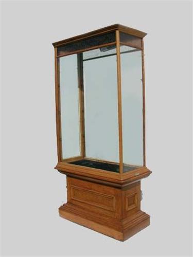 Oak showcase with pedestal and secret door, 74" x 34"W by 18"D. Ex. cond.