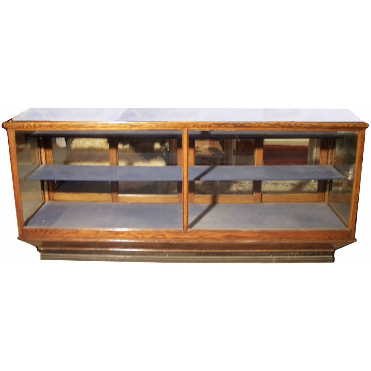 Oak Showcase. Mfg. by Saginaw Showcase Co. Lighted with 2 shelves. 95 X 26 X 42 inches.