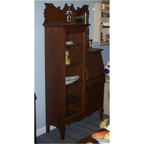 This is an excellent side by side. It has a drop down writing desk on the right with a drawer and storage area under the writing surface. There book case portion, on the left, has four adjustable shelves. It is a dark oak finish and may be original. The glass has been replaced. There do not appear to be any structural repairs. It is a good solid piece. Other than coming from an auction in North Carolina, its history is unknown.