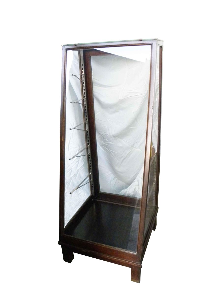 Oak Slant Front Showcase. Five glass shelves. Very good original condition. 24 X 59 X 24 inches.
