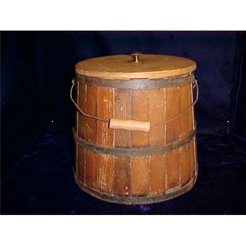 Handmade blacksmith design. Fitted slats held in place by 3 metal bands. Lid with metal knob; metal handle and fittings with wooden hand hold. Very nice piece in remarkably good condition.