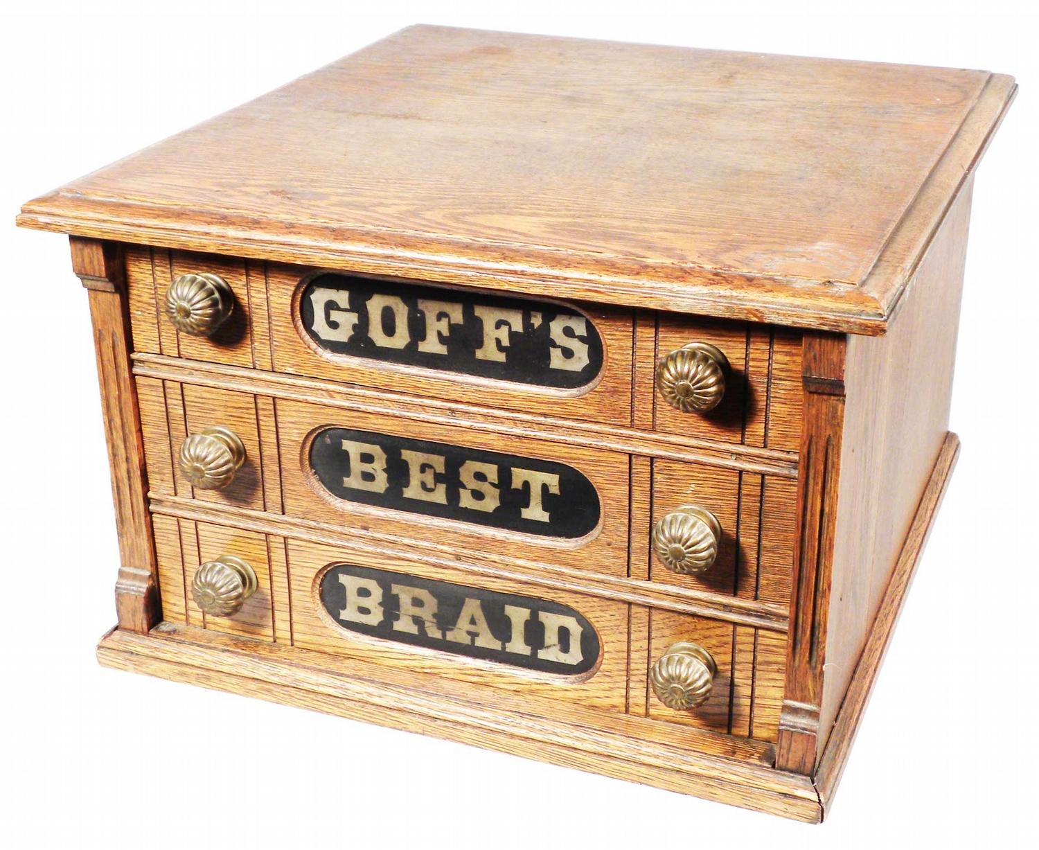 Oak Spool Cabinet for Goff's Best Braid. Three drawer with original hardware. Excellent condition. 17 1/2 X 11 1/2 X 18 inches.