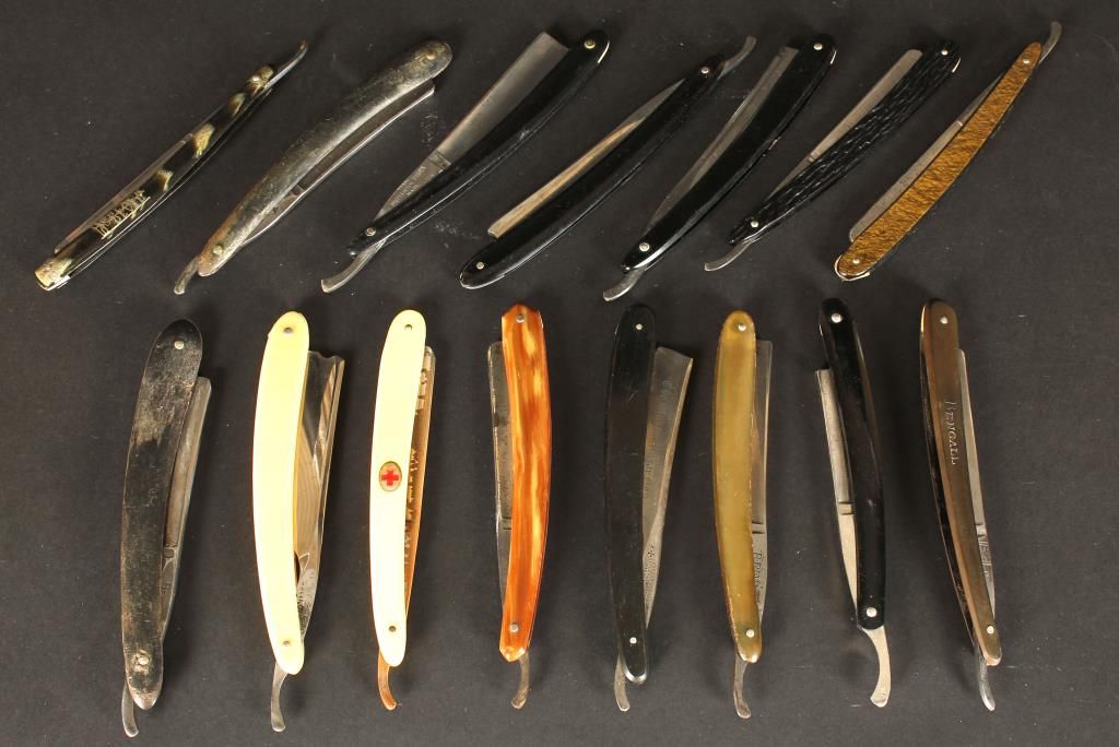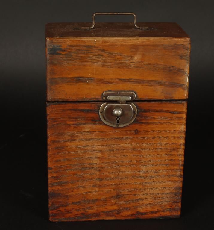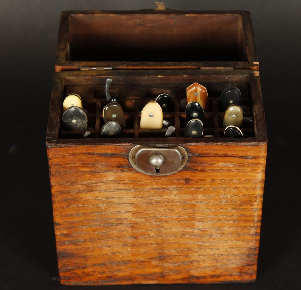 (1) Genco with red cross on handle. (1) Blackwing. (1) Black Devil with small devil figure on handle. (9) Others by various makers. Case has locking mechanism but NO KEY. Case 8-3/4" tall x 6-1/4" wide x 3-1/2" deep.