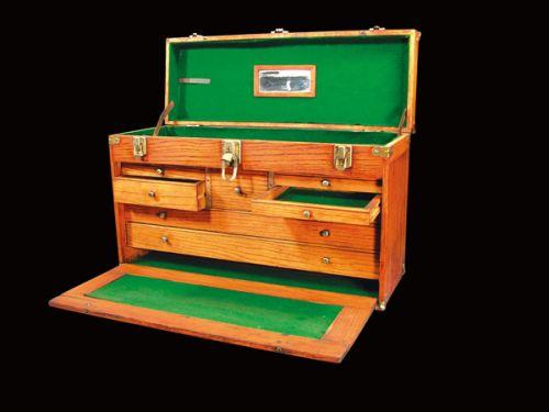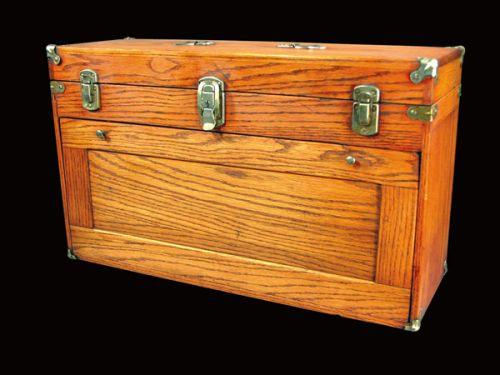 Oak Tool Chest, missing leather handle on top lid. Excellent refinished condition. 28 X 15 X 9 1/2 inches.