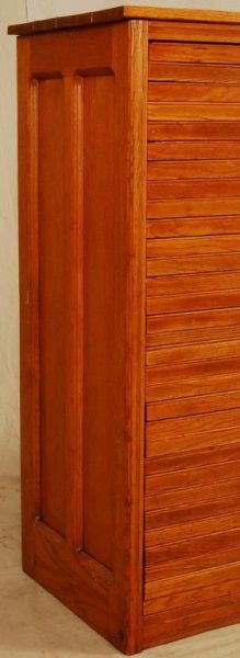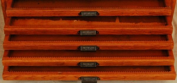 Manuf. by Hamilton Manufacturing Co. With original cast iron pulls on each of the 30 drawers. Cabinet is held together by long steel bolts with the ends on the top still capped with wood dowels.