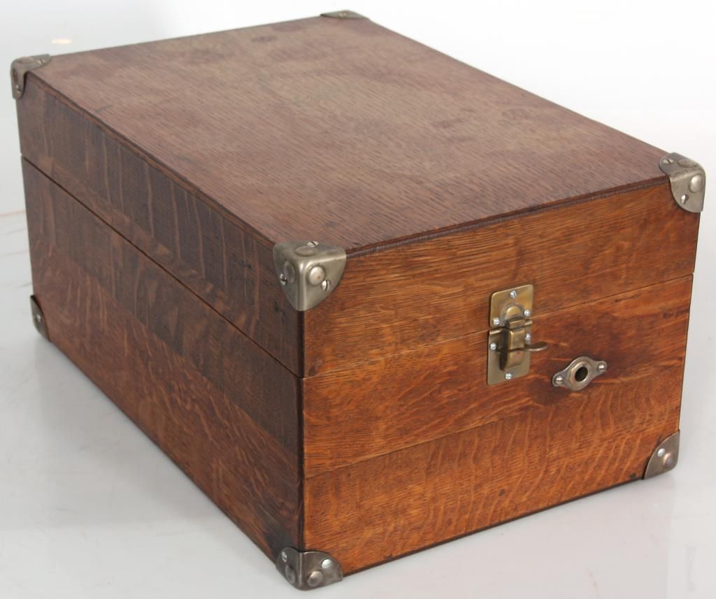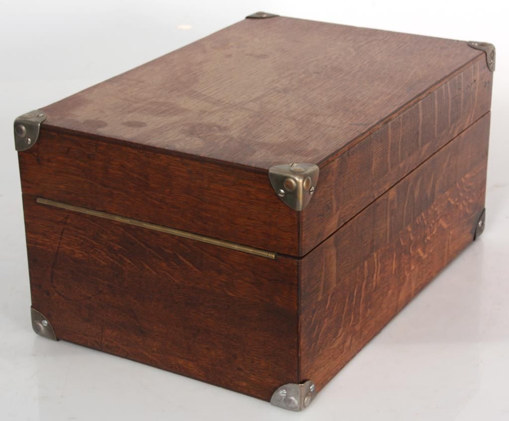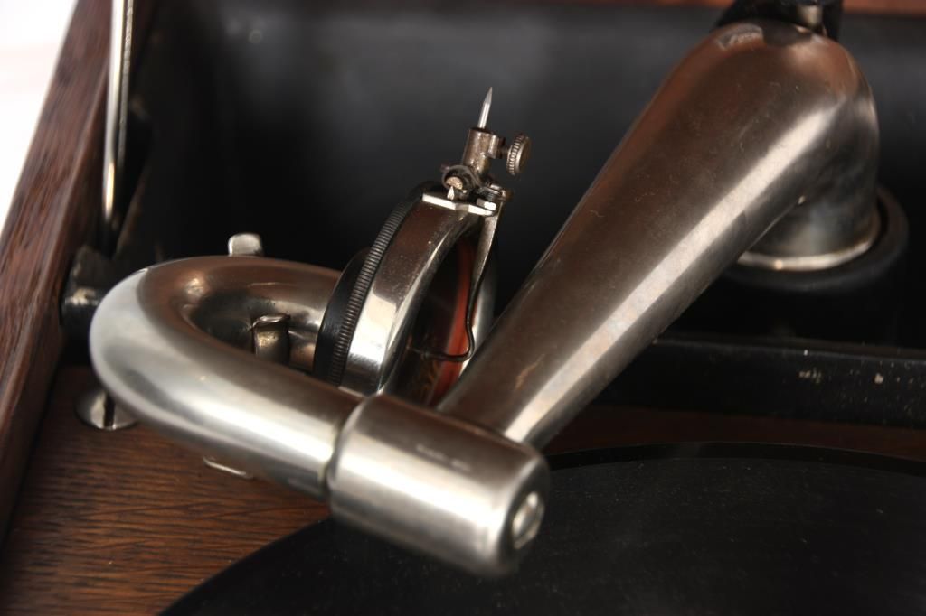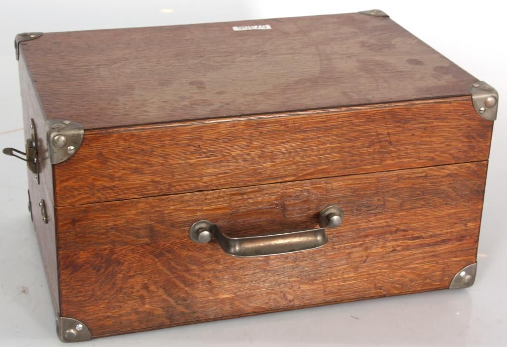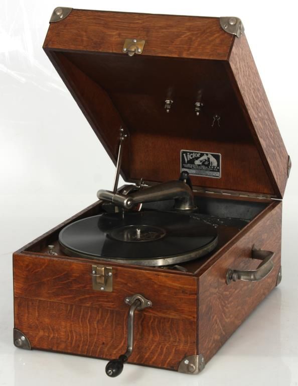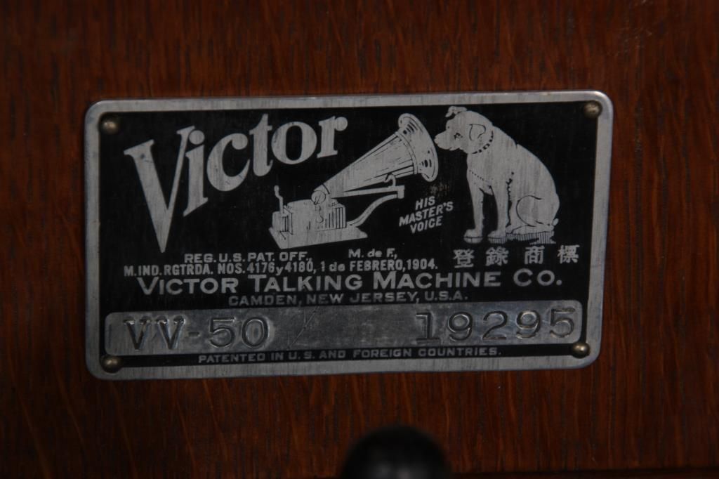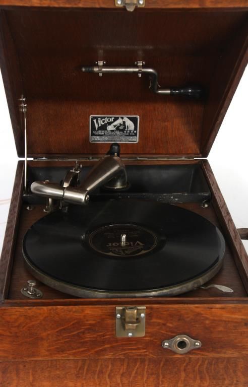 Oak Victor Portable VV-50 Victrola. Oak suitcase type case with nickel corner mounts, handle and single latch on the front; hinged lid exposes the 10 in. turn table, tone arm and No. 2 style reproducer, has a built in speaker system in the body of the case and crank in the front. Victor Talking Machine Co. signature tag inside with model VV-50 and serial number 19295. In good condition and original finish. 9 in. high x 12 in. wide x 17.5 in. deep.