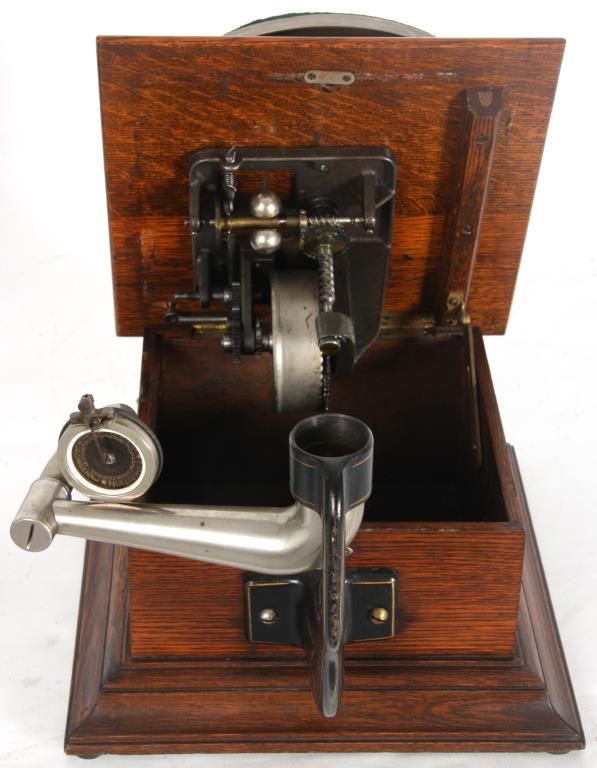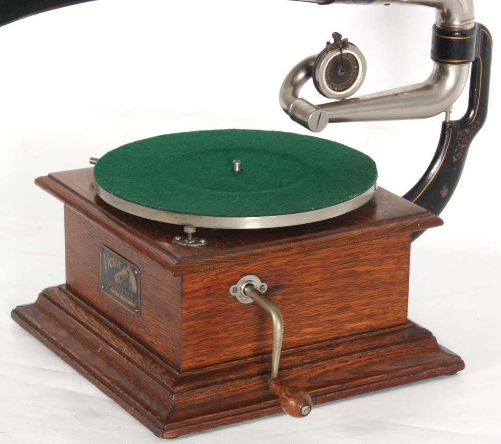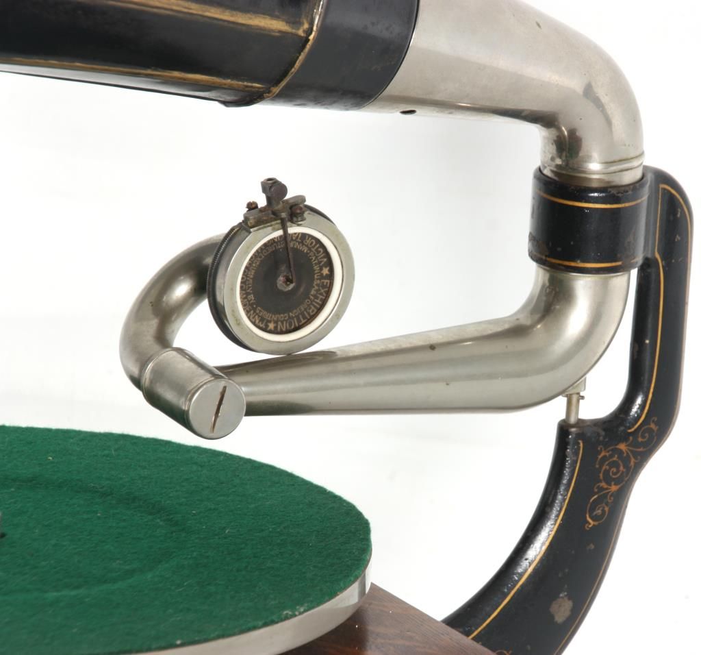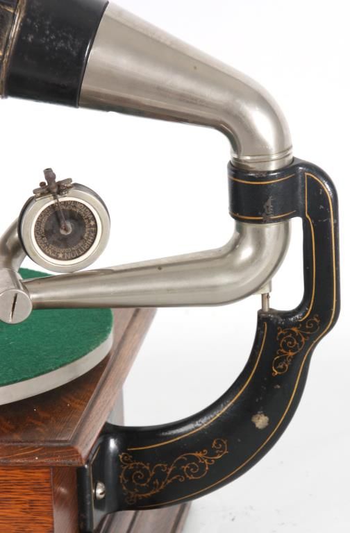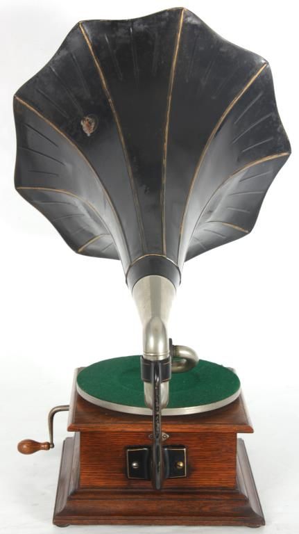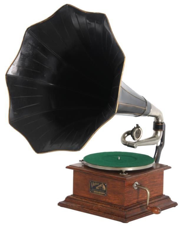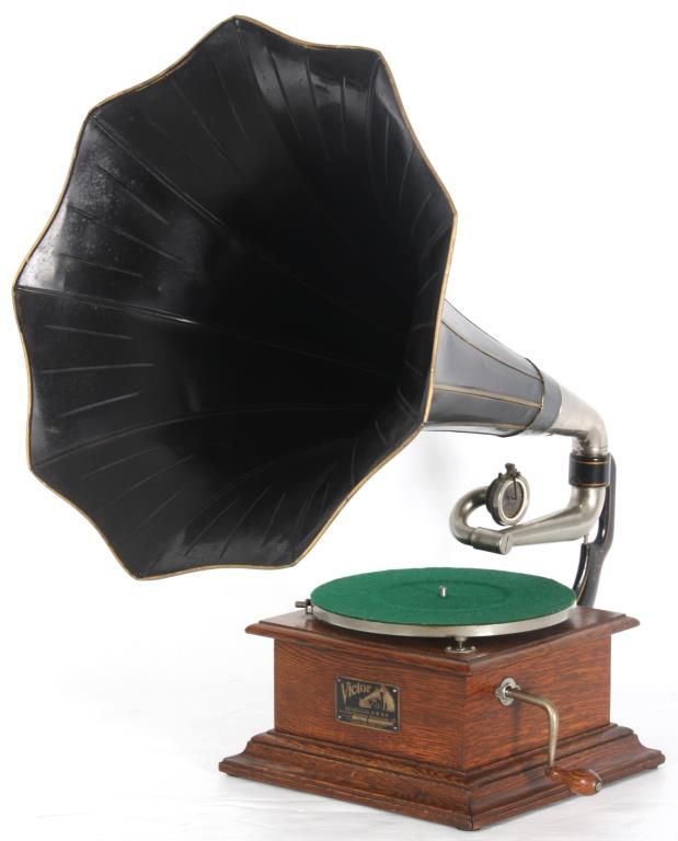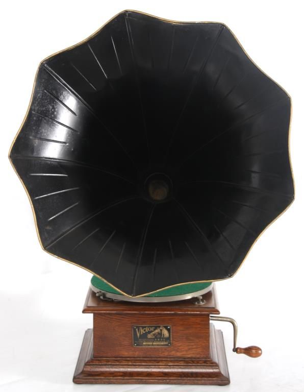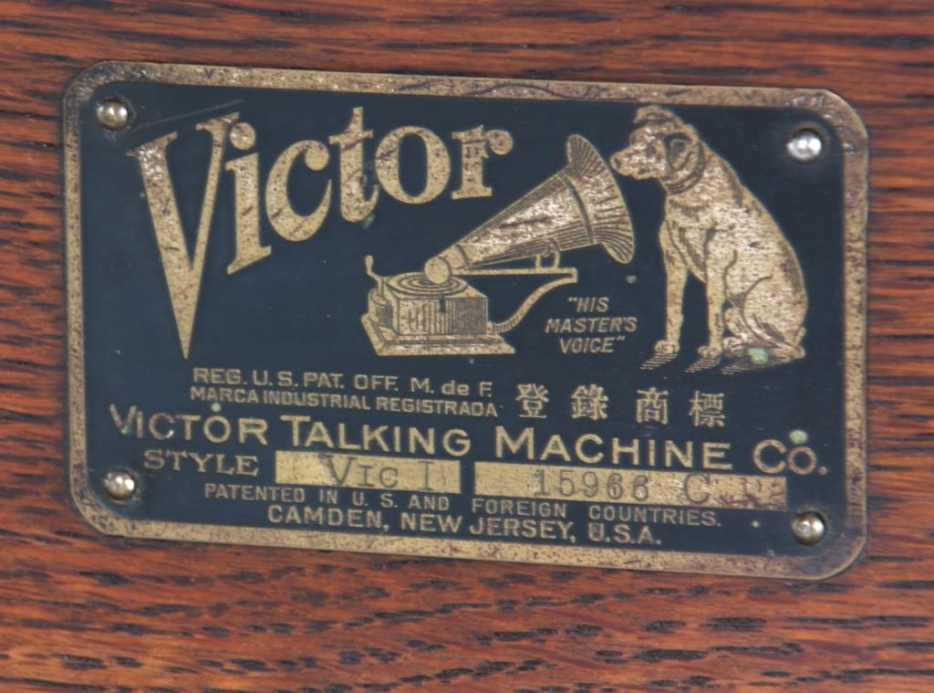 Oak Victor Type I Phonograph. Oak case with 10 in. spring driven turn table; rear mounted horn with black painted support arm, tone arm with Exhibition style reproducer and metal 9 panel high point horn with lobed rim, painted black w/ decal, 16.5 in. high x 17 in. dia. Signed on a brass tag “Victor Talking Machine. Co.” type Vic I and serial number 15966C. Overall dimensions 27.5 in. high x 12 in. wide x 16 in. deep.