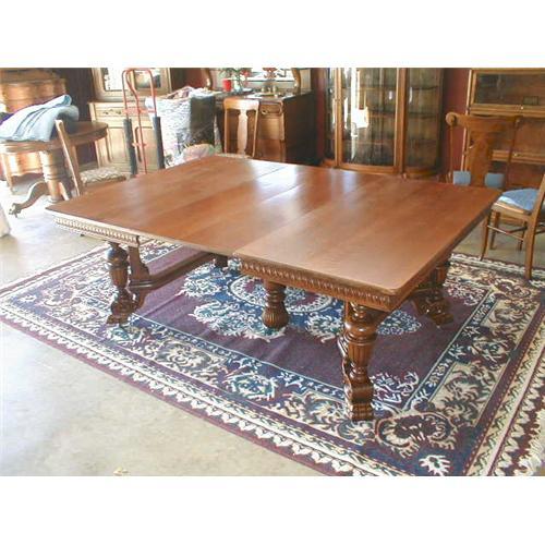 Here is a large , victorian era -1880, dining table that is 54 inches wide and extends to 114 inches long. The current table has two 12 inch leaves that extend the table to 78 inches long. This table has outstanding Victorian legs that are carved and turned to produce a gothic look with a large,stylized clawfoot. The two legs on each end are joined together by a curved crosspiece. The table skirt is solid oak in the Victorian egg and dart design. The large center leg is turned and the end cap is reeded. This table has a very, gorgeous, decorative look that is truely victorian. Everything is made from solid , quartersawn oak with beautiful tiger stripe oak on the top. Additional , tiger stripe oak, matching leaves can be made for $150.00 each. This is a very special table that is ready for you home or office. The table has been refinished and reglued to provide another 100 years of service. This is a quality piece from Staebel Antiques.