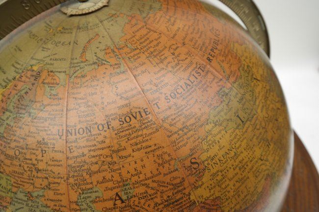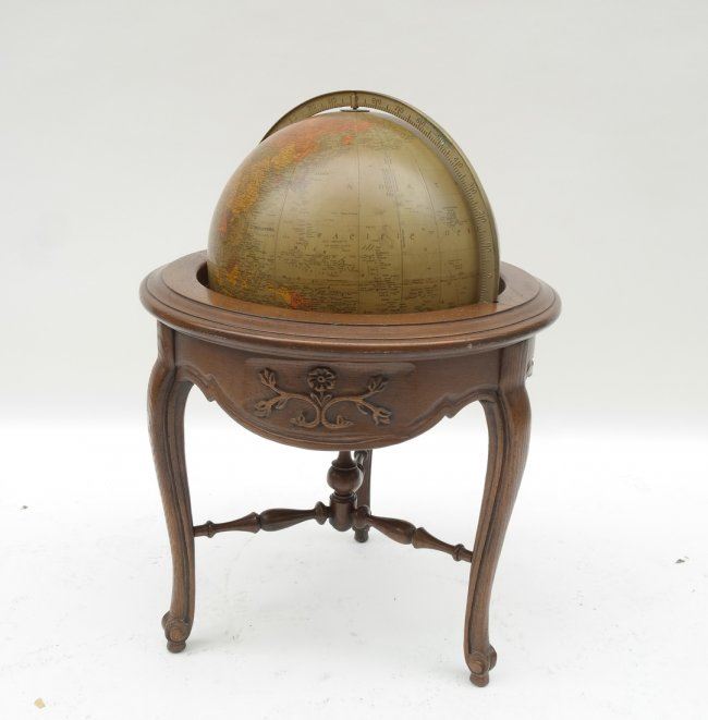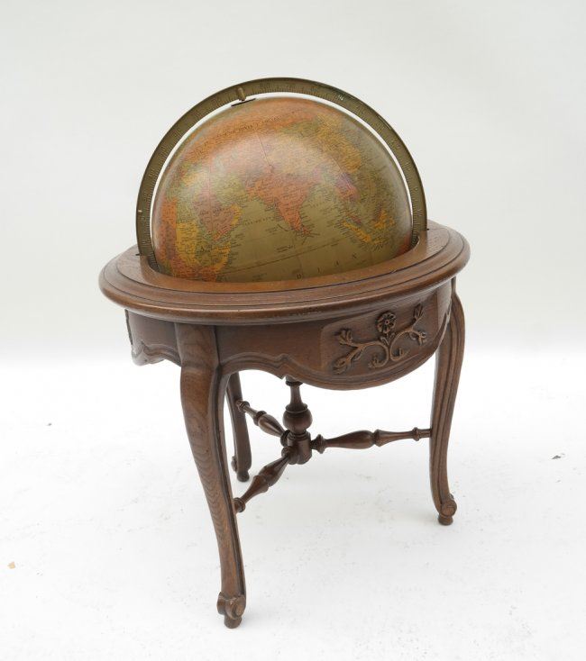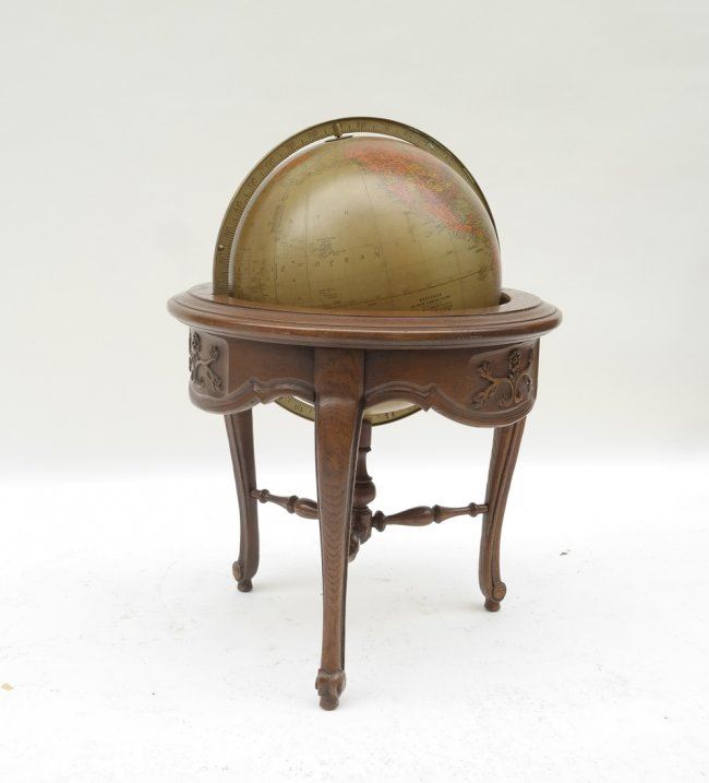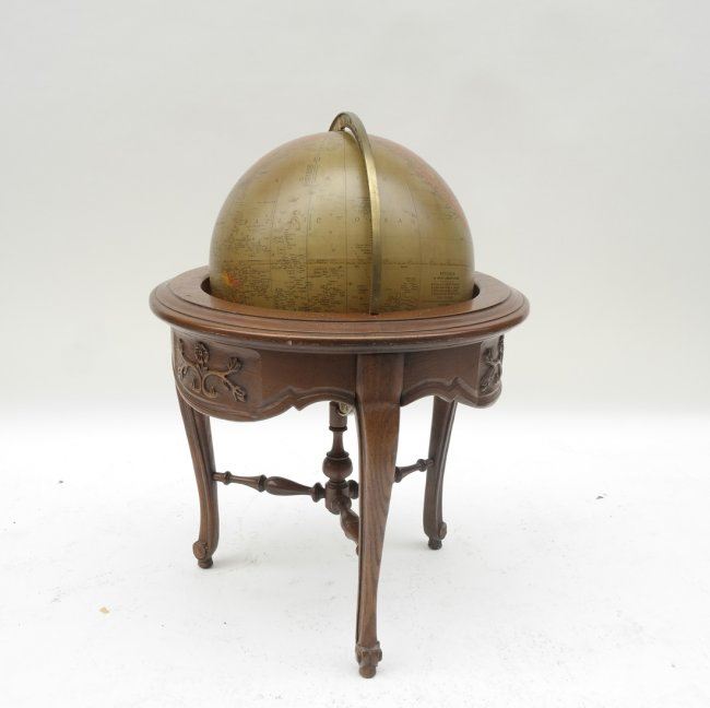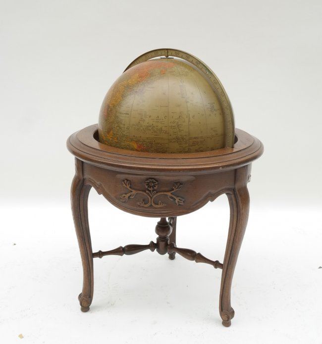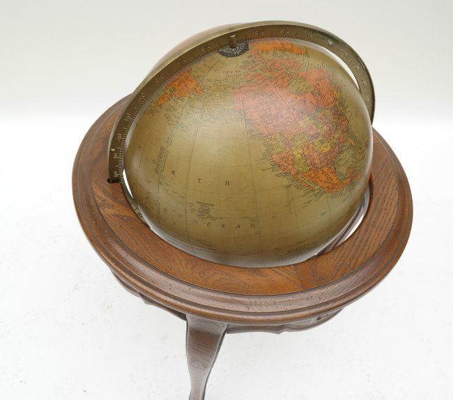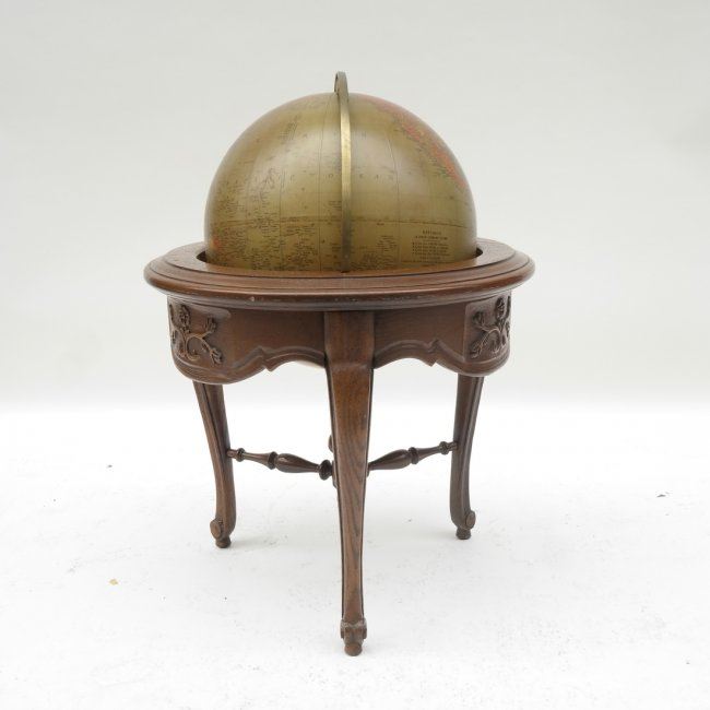 Oak world globe. [25" approx dia; Base x 30" H]. Some chips and scratches.