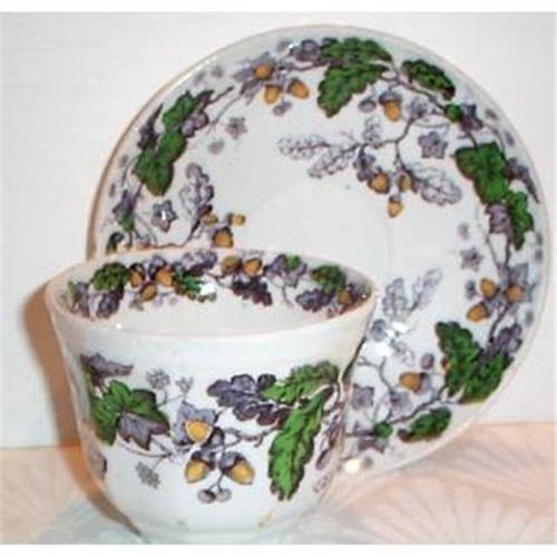 This extremely stunning Transferware Design is entitled Oak and Ivy and has green ivy and oak leaves and brown acorns adoring the ironstone. This cup and the saucer is in SUPERIOR condition with no chips, cracks, dings or hairines and the cup measures 3.75" in diameter and is about 3" tall and the saucer is 6" in diameter and is marked on the back with the familiar Clementson Logo.