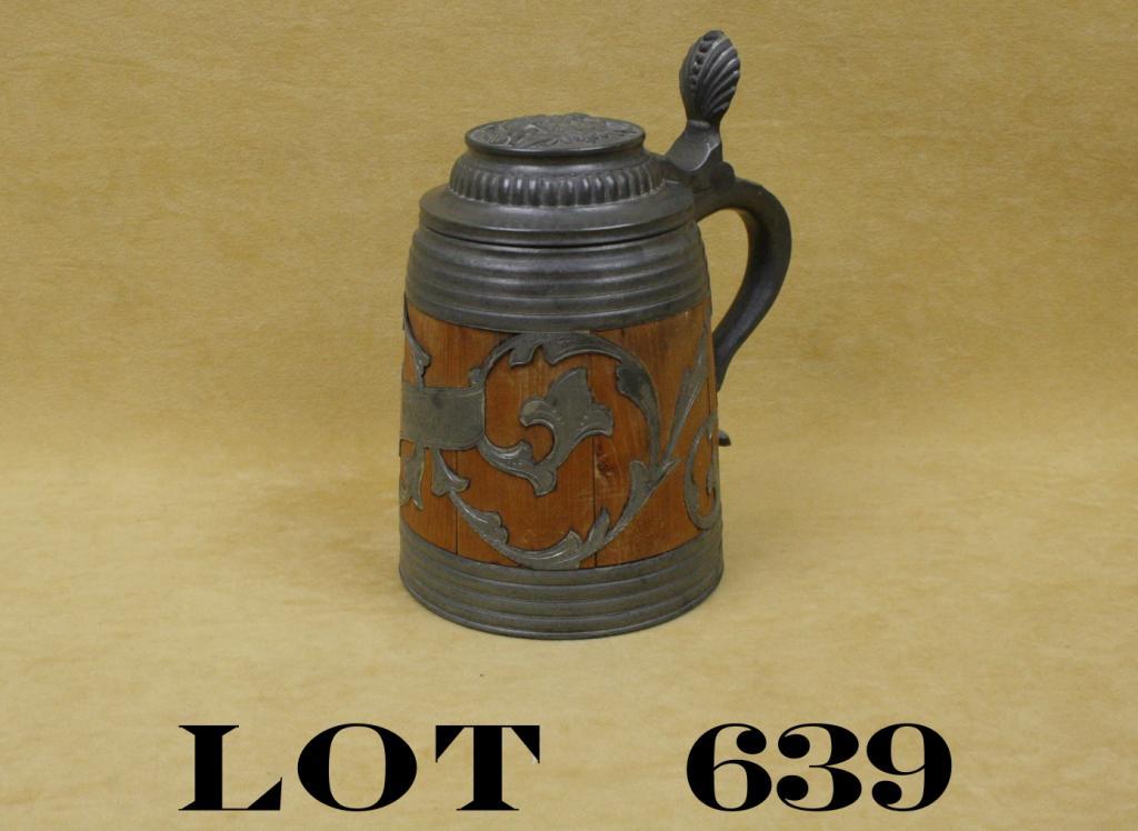 Oak and metal German-style stein, approx. 6” high with an embossed metal lid showing a nicely ornamented body with floral scroll over parts of the wood body and the word “Pittsburg” inscribed on a shield on theoverlay; in overall good condition at time of description. Est.: $50-$100.