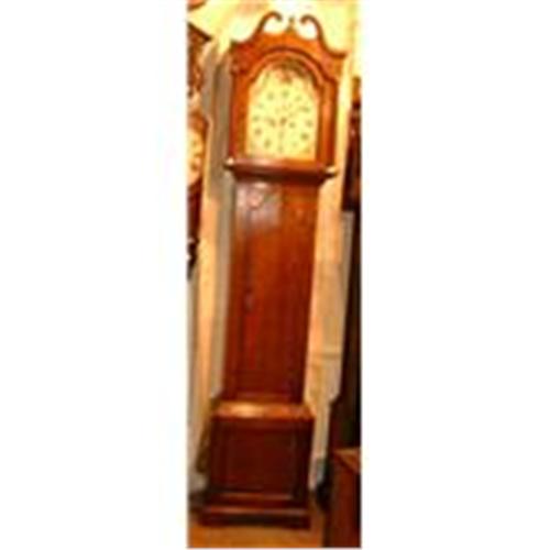 Oak cased longcase painted dial 8 day clock with rolling moon depicting various scenes including a ship in good working order