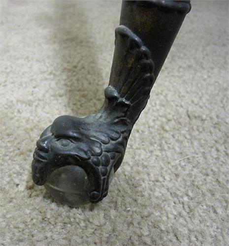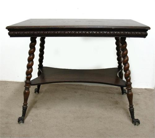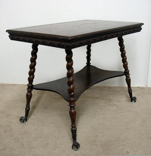 Oak center table; rectangular top over stylized carving on apron; with undershelf; four rope turned splay legs terminating in brass claw and glass ball feet; late 19th C.; measures 28 1/2" high x 36" across x 24" deep (no visible defects)