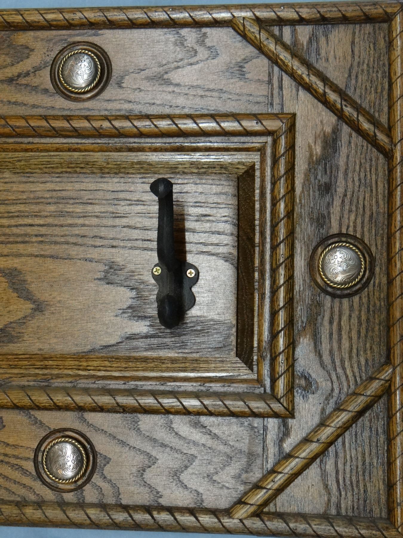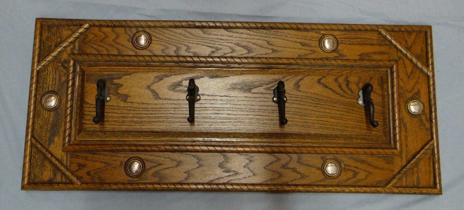 Oak coat rack, 4 hooks, 6 conchos, 17" h x 41" w, newer, newer