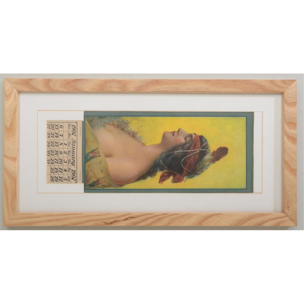 Oak framed and matted original color office calendar from 1907 with classic Indian maiden artwork approx. 16” x 18” and in excellent condition with beautiful colors and features; copyright 1906 by Hayes. Est.: $100-$200.