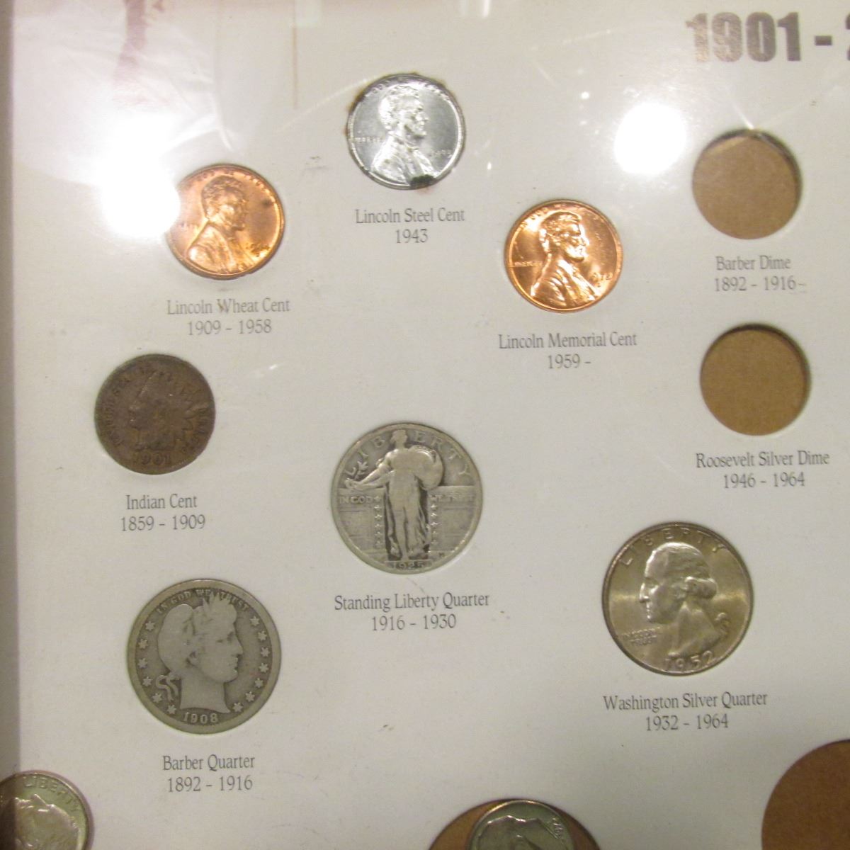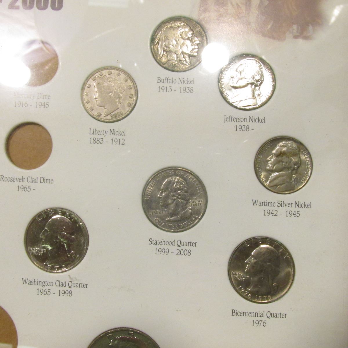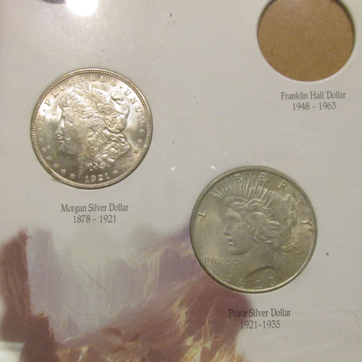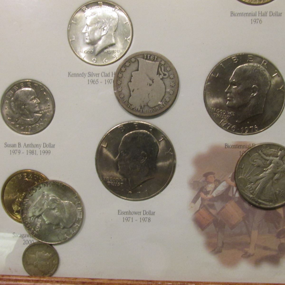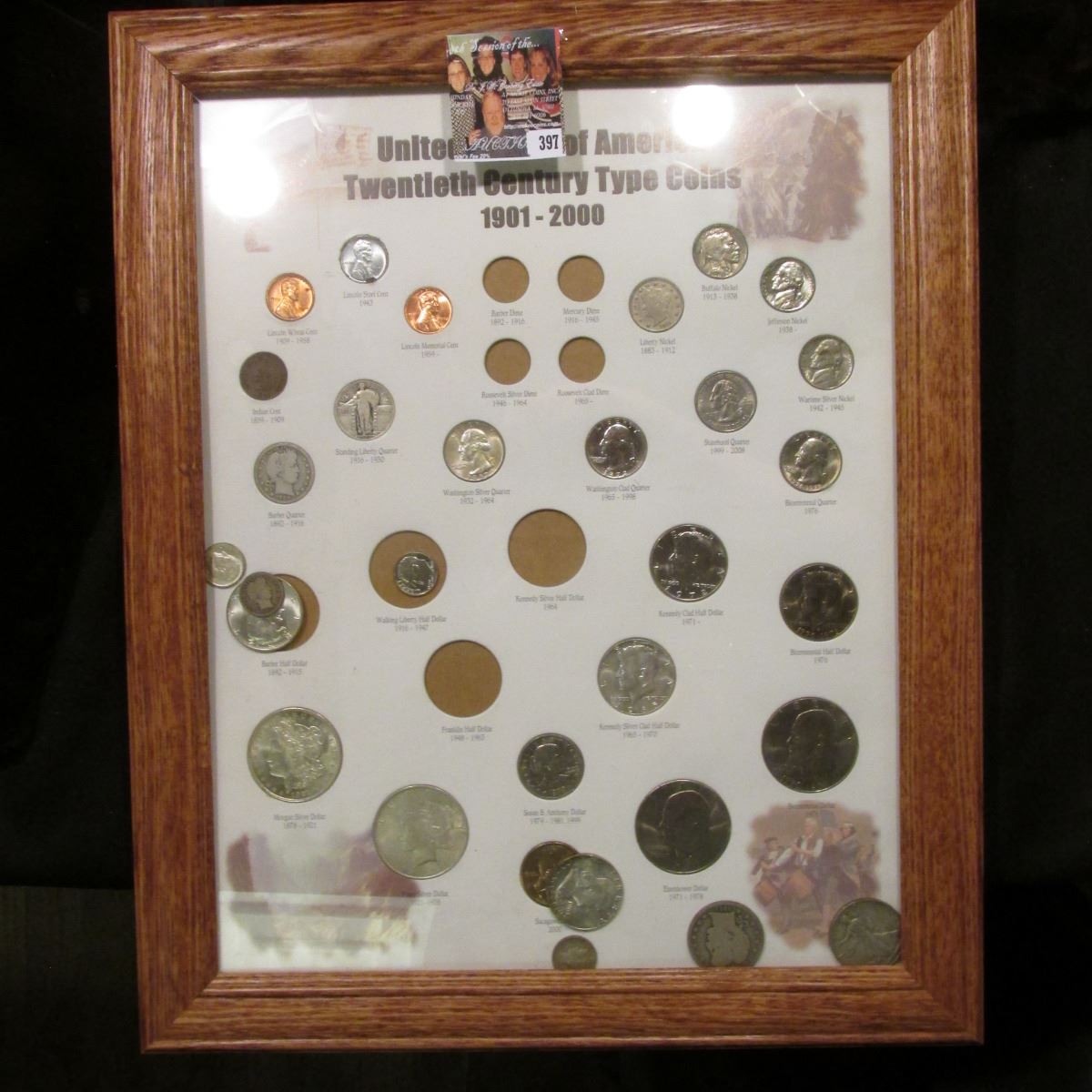 Oak framed set of "United States of America Twentieth Century Type Coins 1901-2000", some of the coins are loose out of their holes, but includes a Morgan Dollar, Peace Dollar, pair of Eisenhower Dollars, (7) Halves dating back to the Barber period, Quarters, Dimes, Nickels, & Cents.