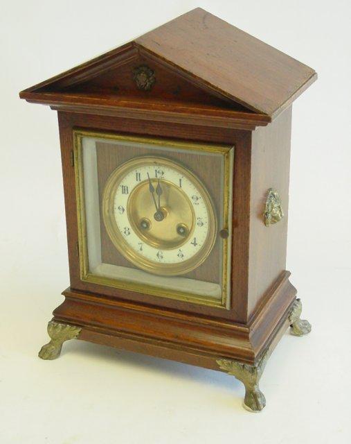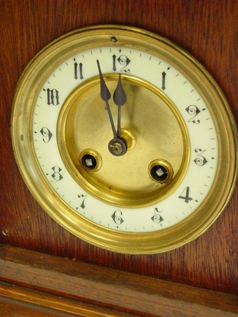 With two key hole, pendulum & key. Two small holes opposite bronze head above face, lion face mounts on side, enameled numbers, open door front & back. Approx. 13" H x 9" W. From the NYC estate of Milton & Dorothy Nowack.