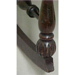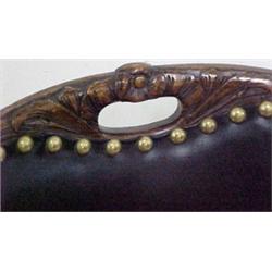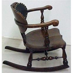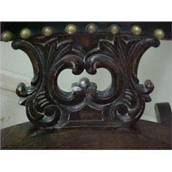Oak rocker, carved crest rail with cut-out handle, leather upholstered back with brass tack perimeter, over carved pierced splat, open arms, saddle seat, H-stretcher base, early 20th C. Estimate 80/150