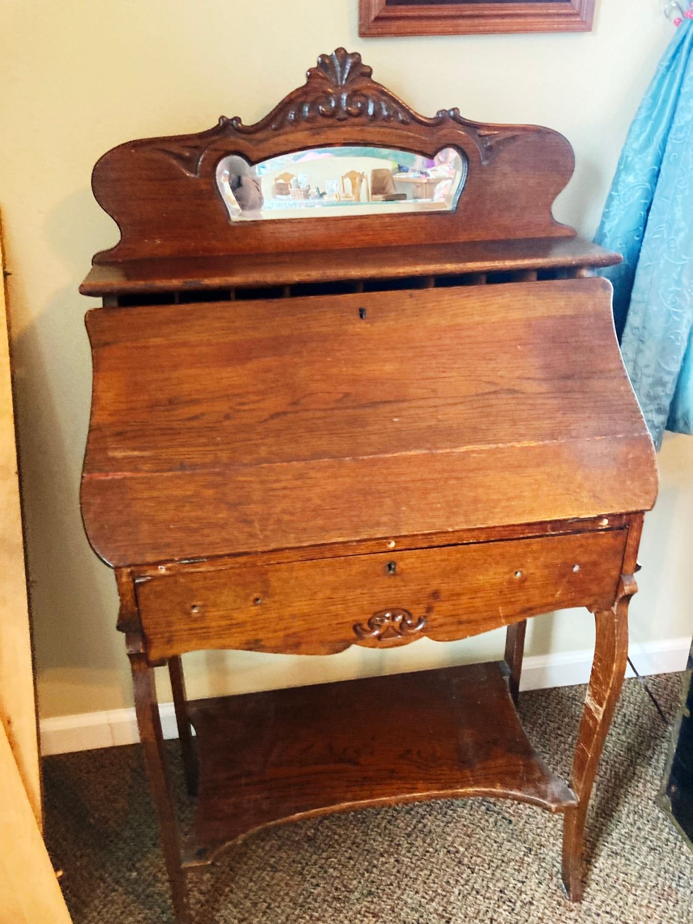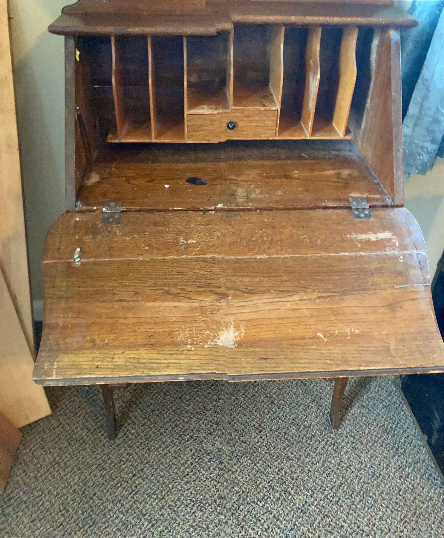 Oak secretary w/bev. mirror, 50” h x 28” w, restorable. NO SHIPPING THIS ITEM. PICKUP AT AUCTION SITE ONLY.