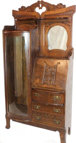 drawers, curved glass door, original shelves, carved and mirrored upper gallery, 14" X 38" X 74". Est. 600-1200